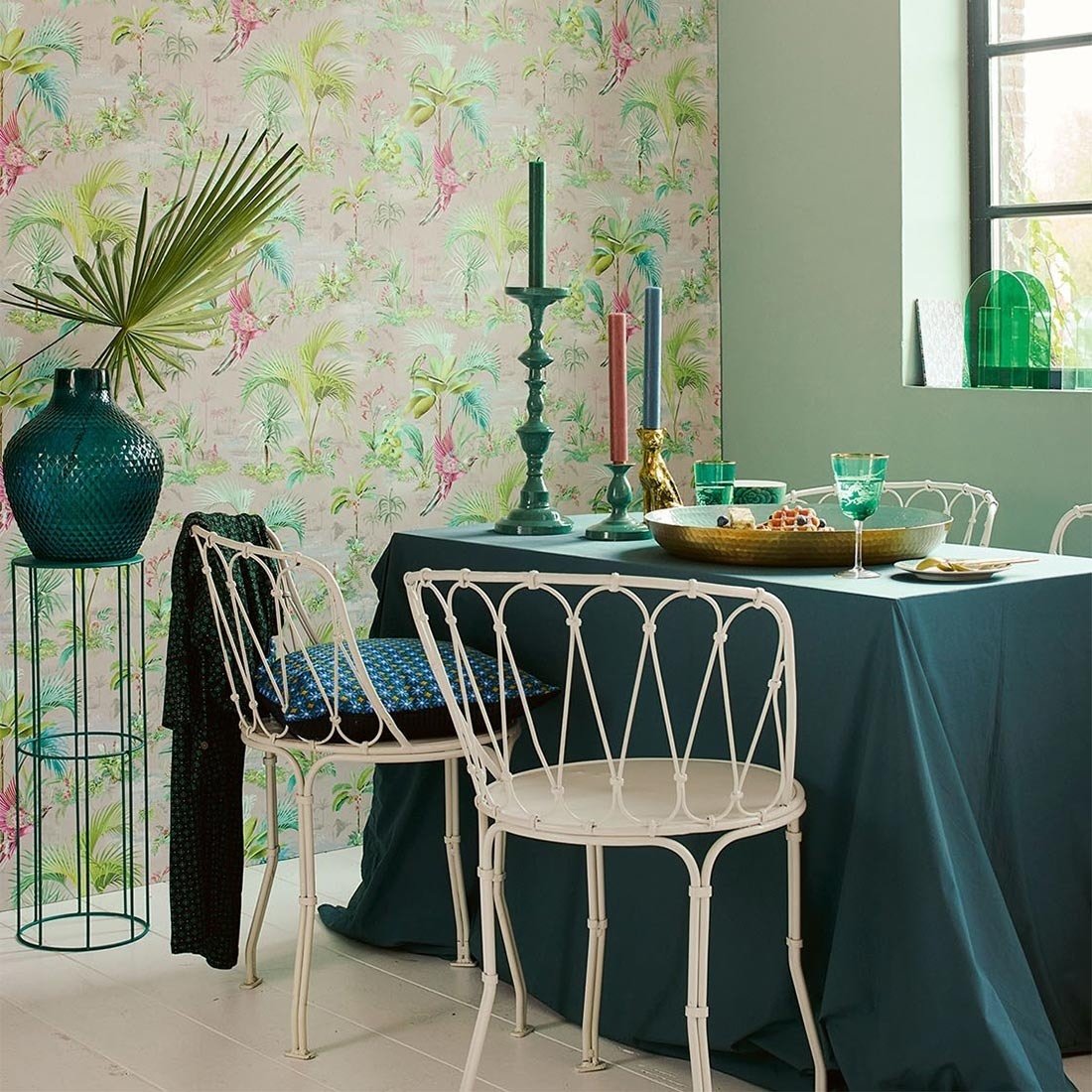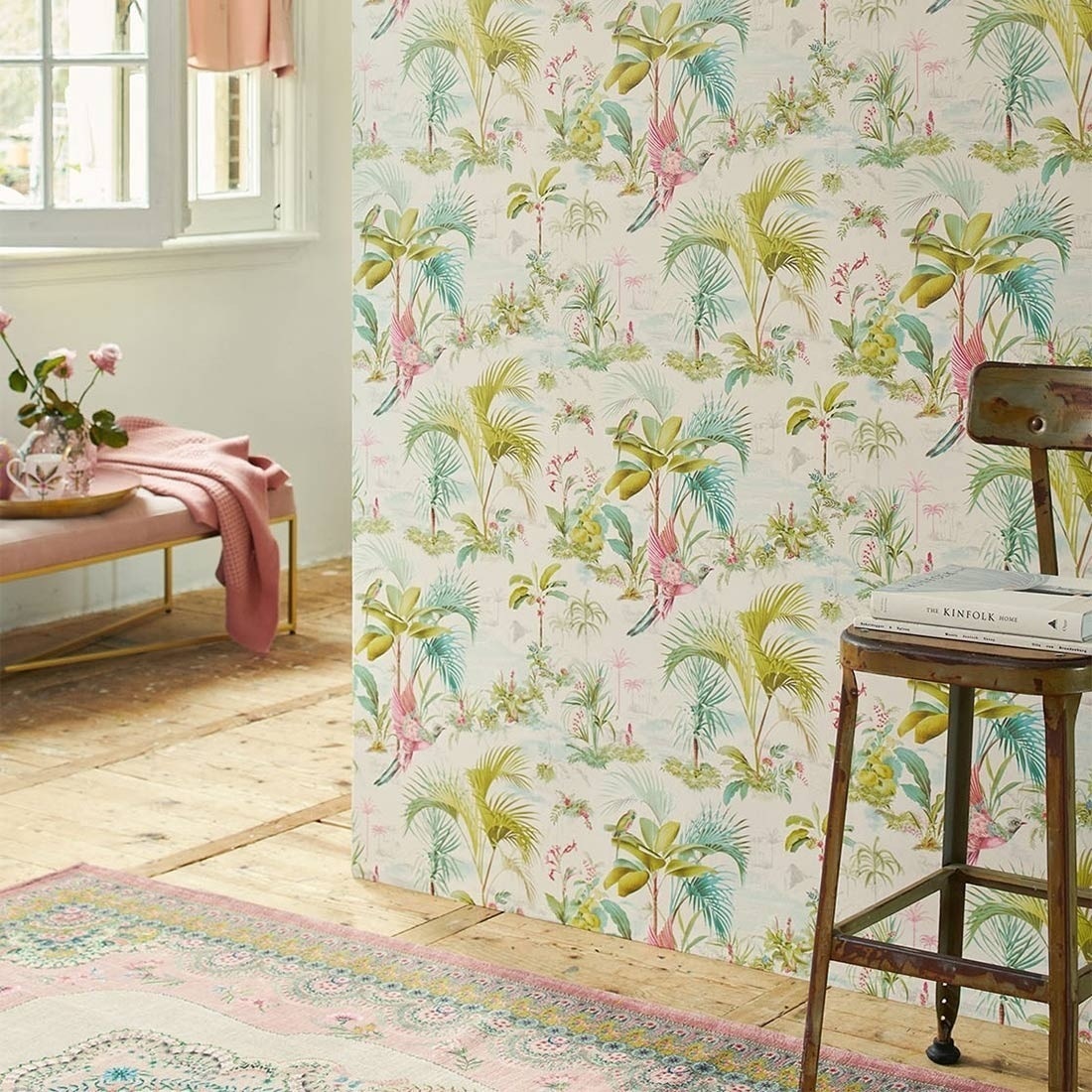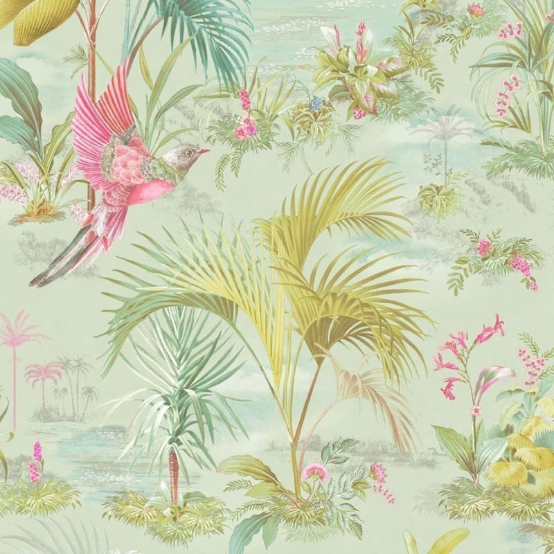 Le papier peint Palm Scene met en avant un motif exotique dans des couleurs douces. Des oiseaux de paradis en plein vol, des palmiers et des variétés de fleurs forment ce design. Le design apporte une ambiance tropicale aux pièces.