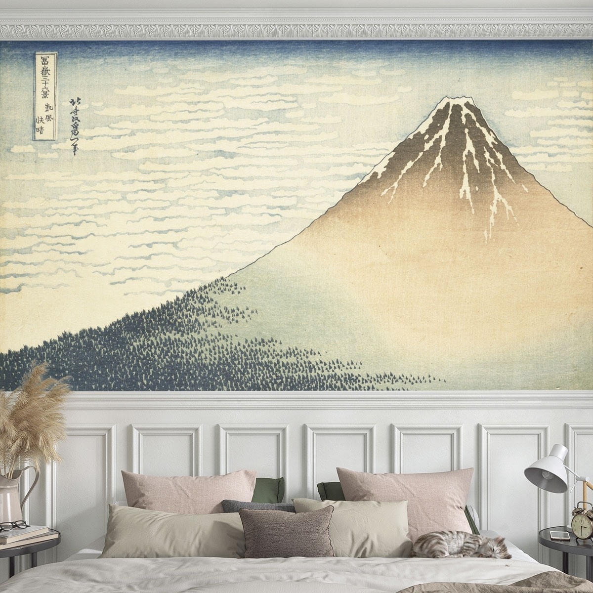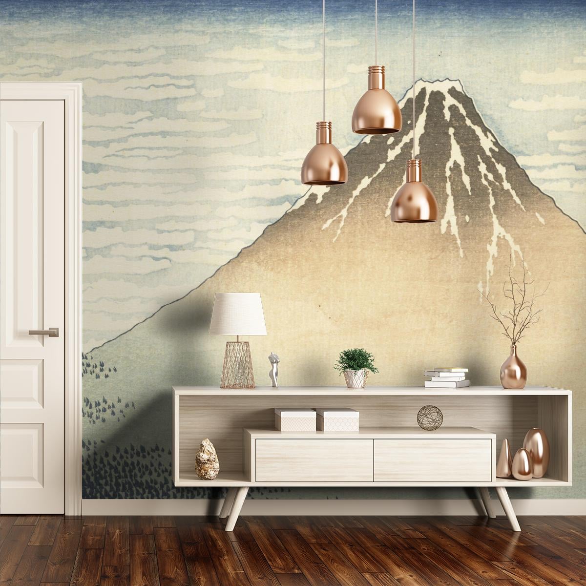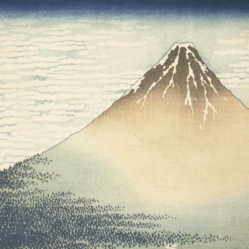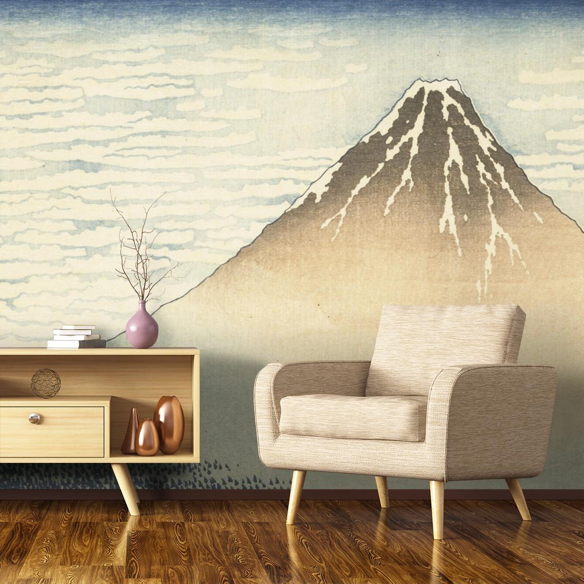 Provenant des archives de la Réunion des Musées Nationaux, l’œuvre originale exposée au Musée national des arts asiatiques – Guimet reproduite sur le panneau Matin Clair est issue de la série les Trente-six vues du Mont Fuji réalisée par l’illustre peintre Katsushika Hokusai. Cette estampe japonaise dépeint une somptueuse vue sur le Mont Fuji partiellement enneigé en son sommet. Grâce aux aux nuages et aux arbres représentés de manière simplifiée, la création est très graphique. Les couleurs douces et apaisantes apportent de la poésie à l’ensemble. Ce revêtement mural s’adapte facilement aux espaces.