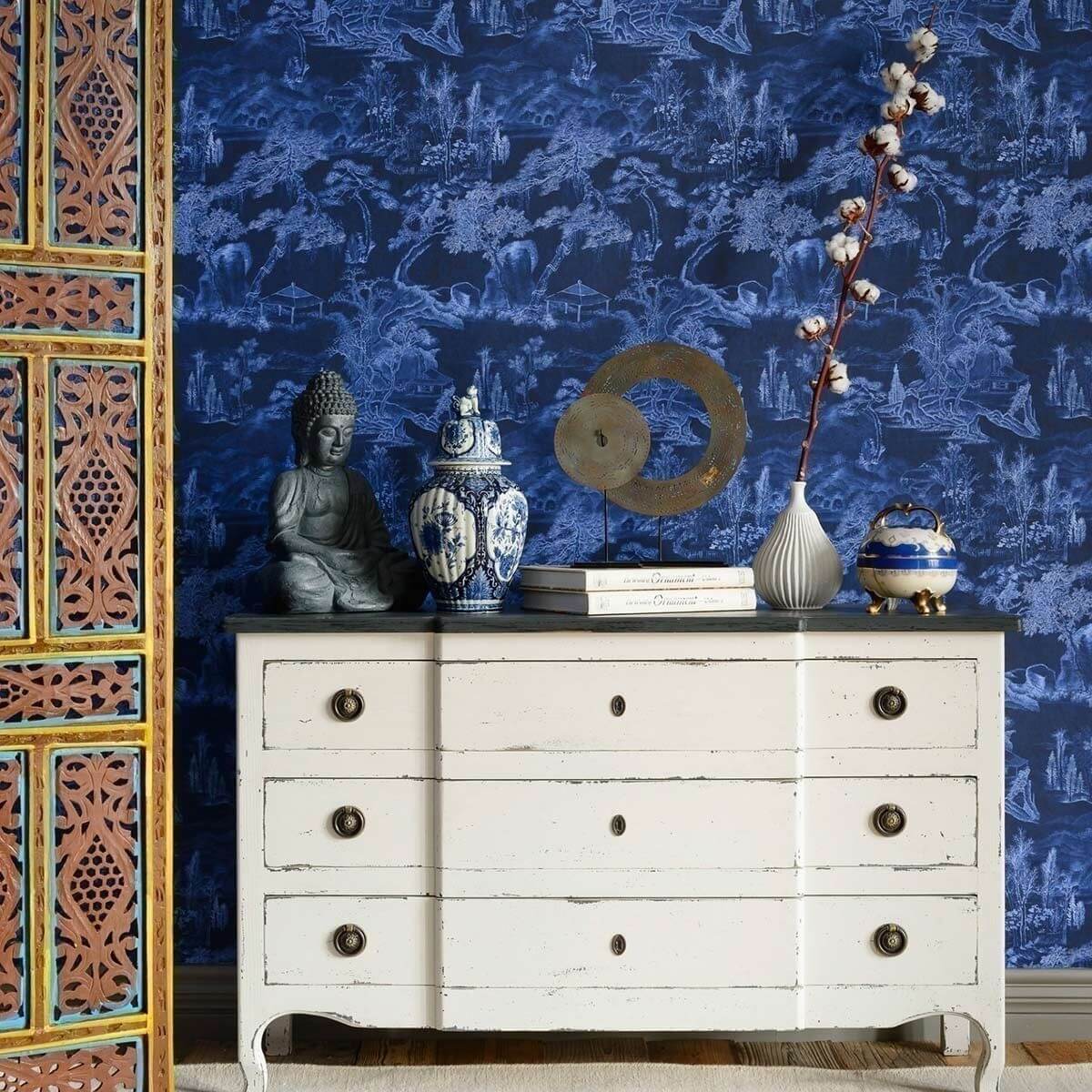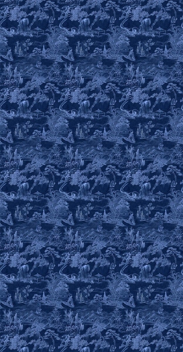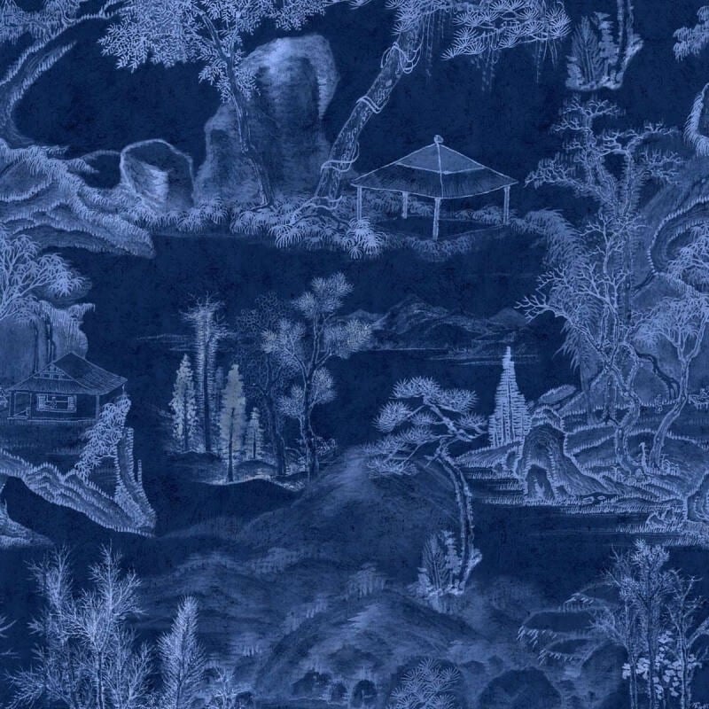 Un paysage formé par des pagodes, des pavillons et des arbres luxuriants compose le motif du panneau Asian Scenery. Chaque élément arbore des détails fins qui confèrent un rendu authentique à l'ensemble. Originalement fait à la main, ce dessin bicolore est inspiré des chinoiseries.