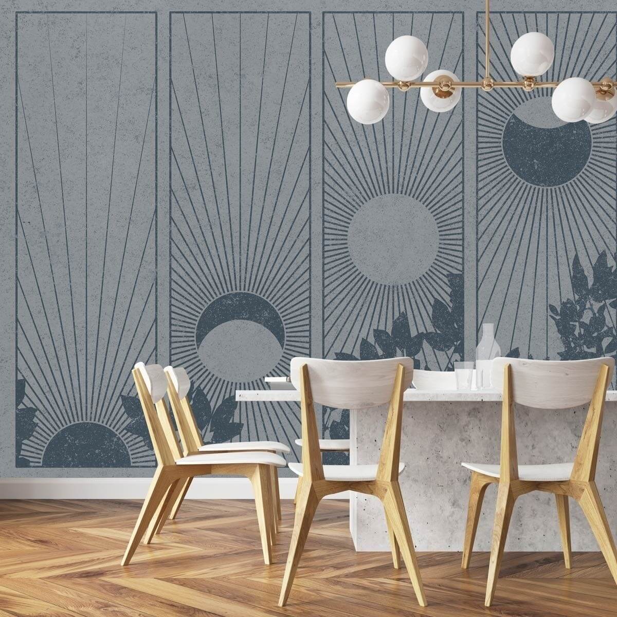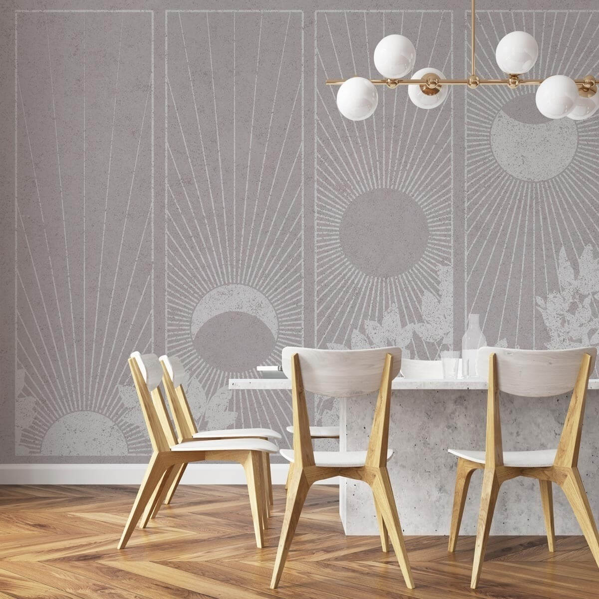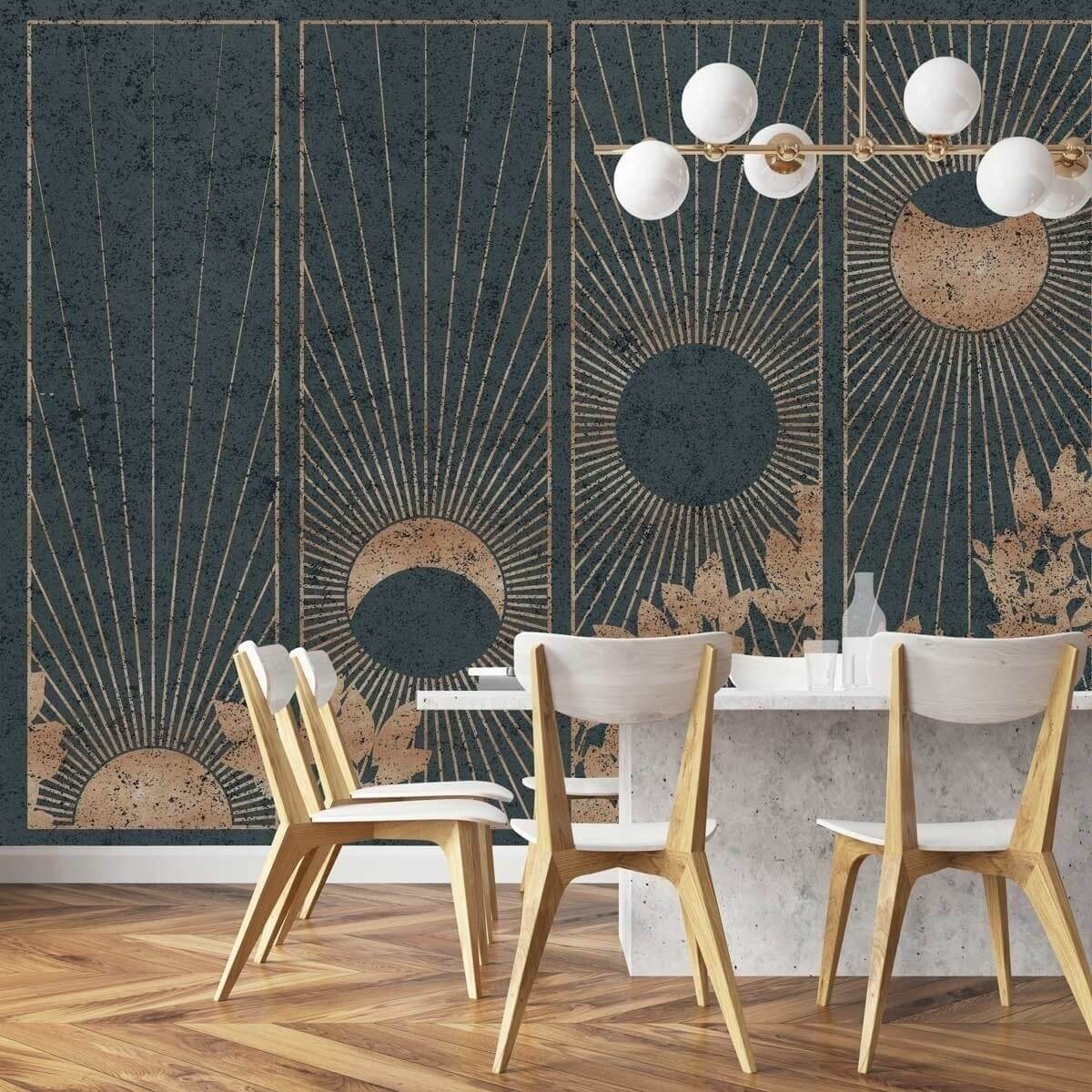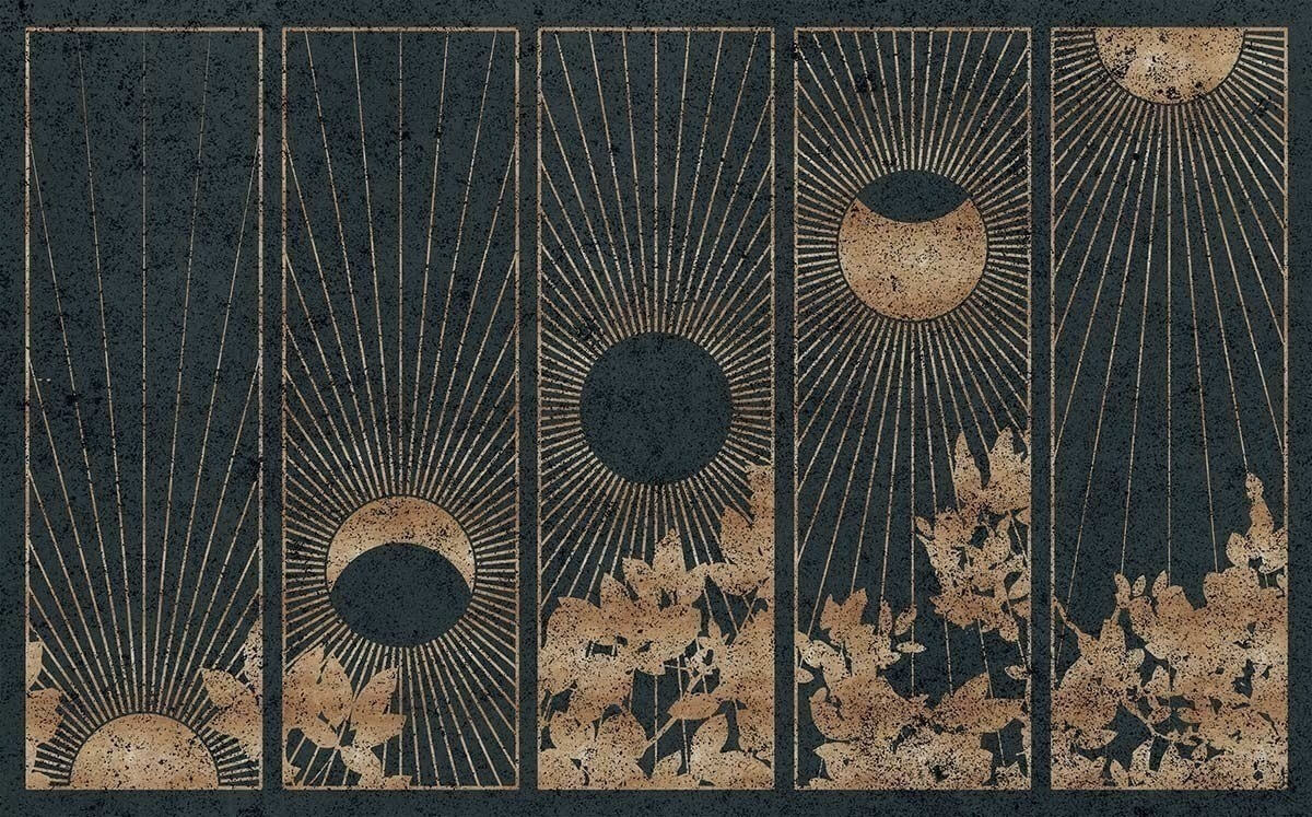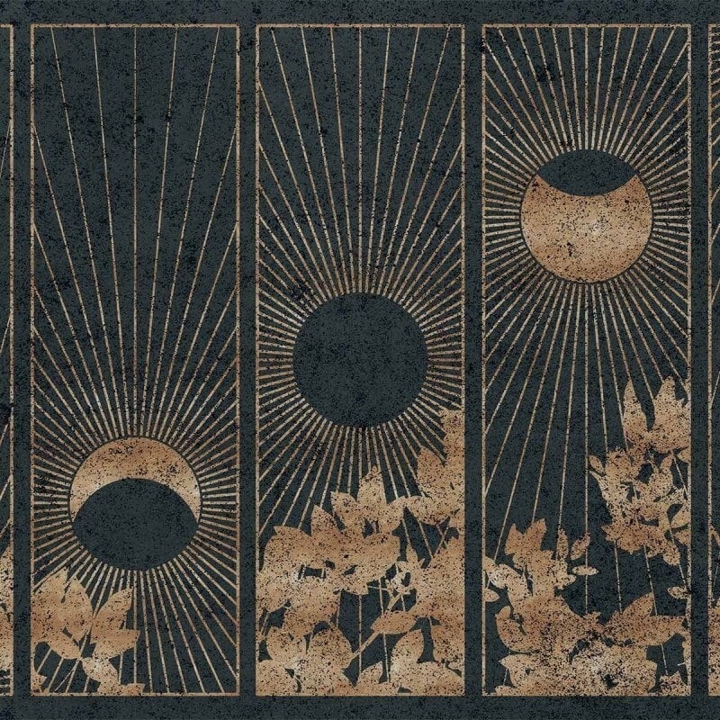 Des panneaux mettant en scènes différentes phases d'une éclipse dominant des feuillages composent le motif du papier peint Da Lat. L’astre dessiné avec de longs et fins faisceaux adopte une palette bicolore de teintes claires et sombres. Le choix de nuances sobres met l’accent sur les détails du design. Ce revêtement mural de Coordonné est décliné dans une version dorée.