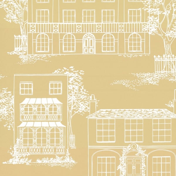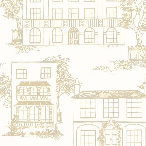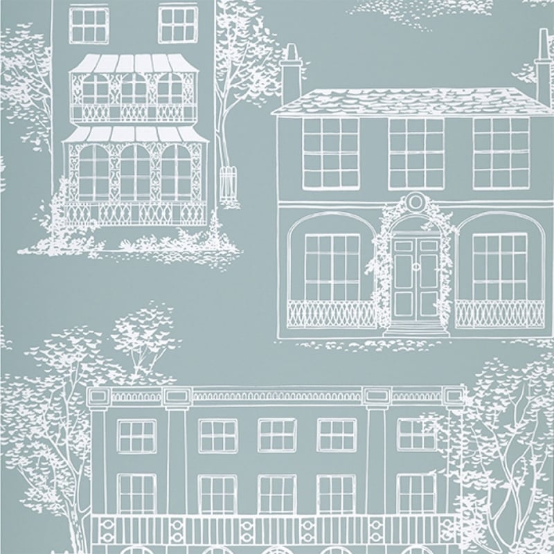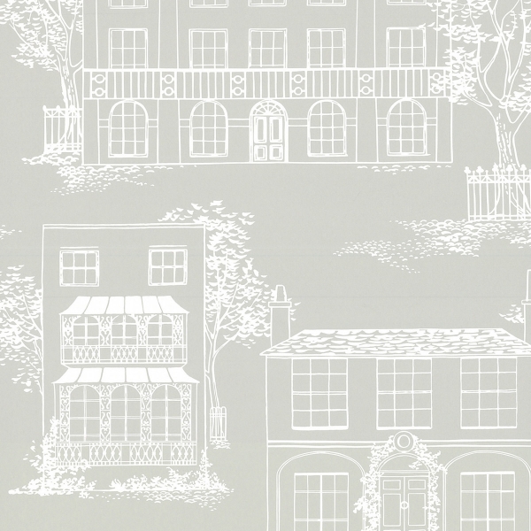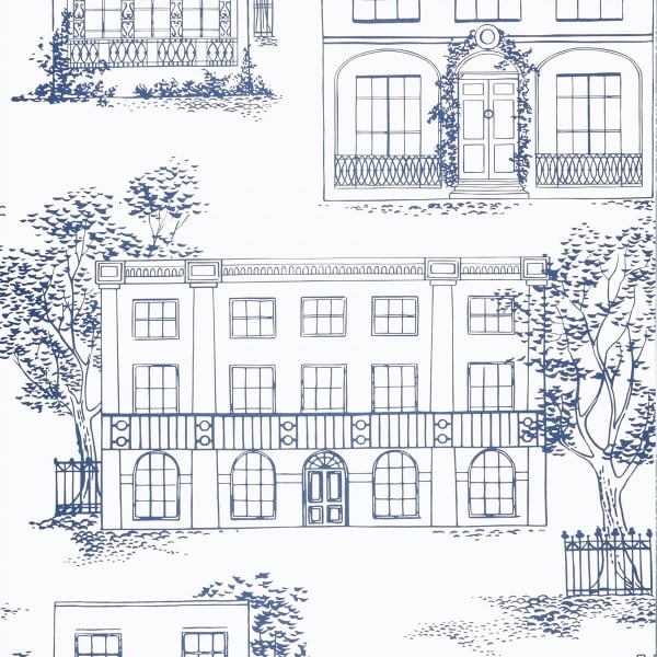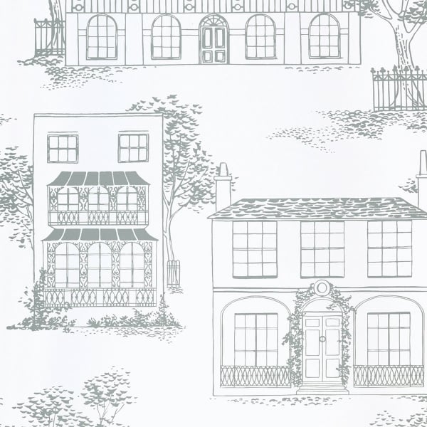 Le motif de ce papier peint représente avec fantaisie une scène urbaine de Hampstead au Royaume-Uni. Les maisons sont reproduites avec simplicité mais sont reconnaissables par les formes géométriques qui font la caractéristique de ce quartier huppé de Londres. Les arbres apportent une touche de gaieté qui contraste avec le côté anguleux des bâtiments pour créer un ensemble cohérent.