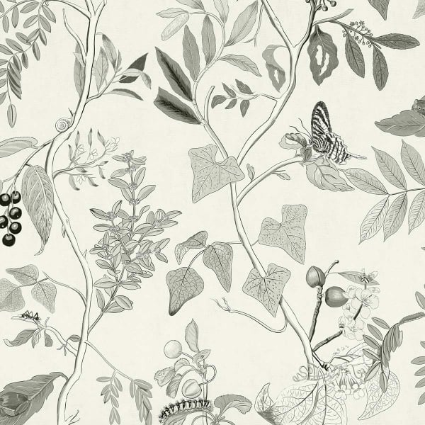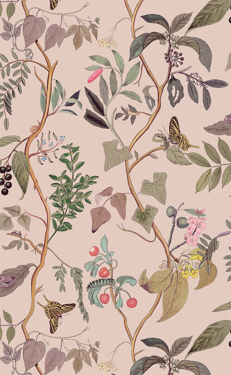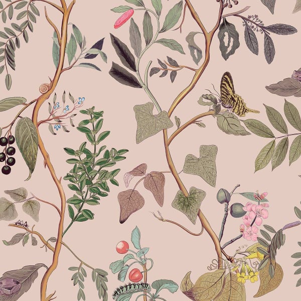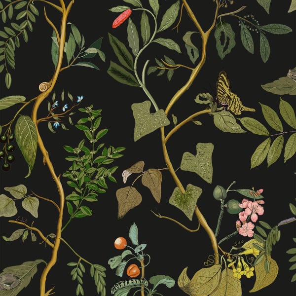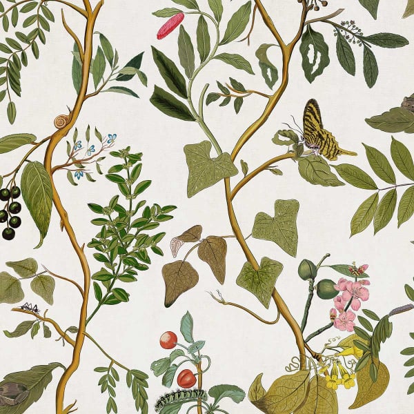 Le papier peint Diderot de la maison Coordonné met en avant des ramures ornées de fruits et de feuilles dans des couleurs naturelles. Des papillons polychromes et des grenouilles complètent ce motif floral. Cette décoration murale apporte un style romantique et audacieux aux intérieurs.