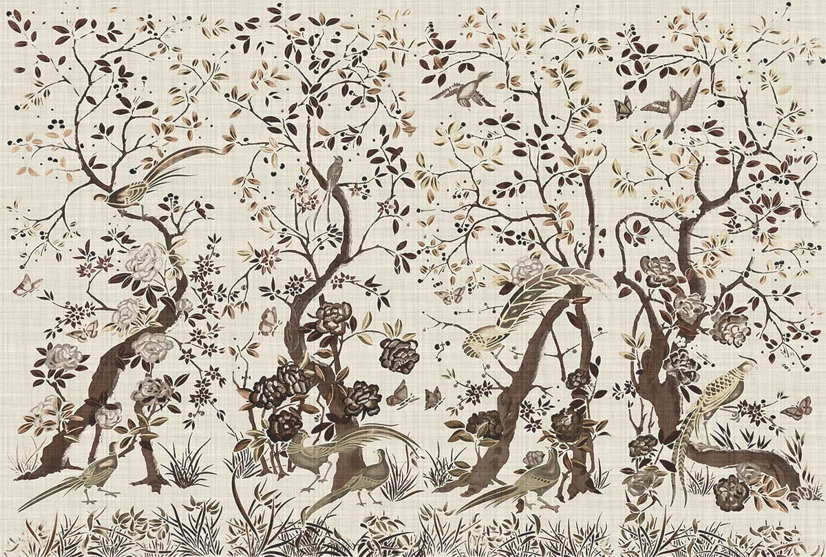 This panel with a large floral motif from Tres Tintas is not lacking in strengths. Branches, herbs, blue pheasants, pink flowers and small berries are displayed on this wall covering with a sea-green background. The contrasting and harmonious colors of this composition highlight a perfectly timeless style.