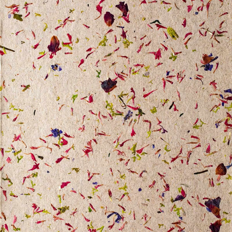Pétales de roses, Bleuets pourpres, Tournesols, Mousses vertes - Support : Intissé de lin