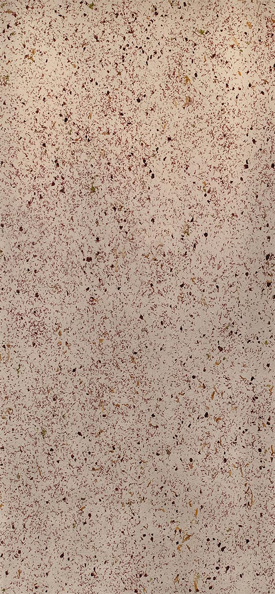 Ce grand panneau décoratif est semé d'un mélange de pétales de roses, de bleuets, de mousse verte et tournesols. Ses qualités visuels, acoustiques et olfactives ont été élaborées par Oberflex, spécialiste des surfaces décoratives éco-conçues.  Son support en lin intissé souple et son liant à base de farine en font un produit entièrement biodégradable, non allergène et respectueux de la qualité de l'air intérieur.
