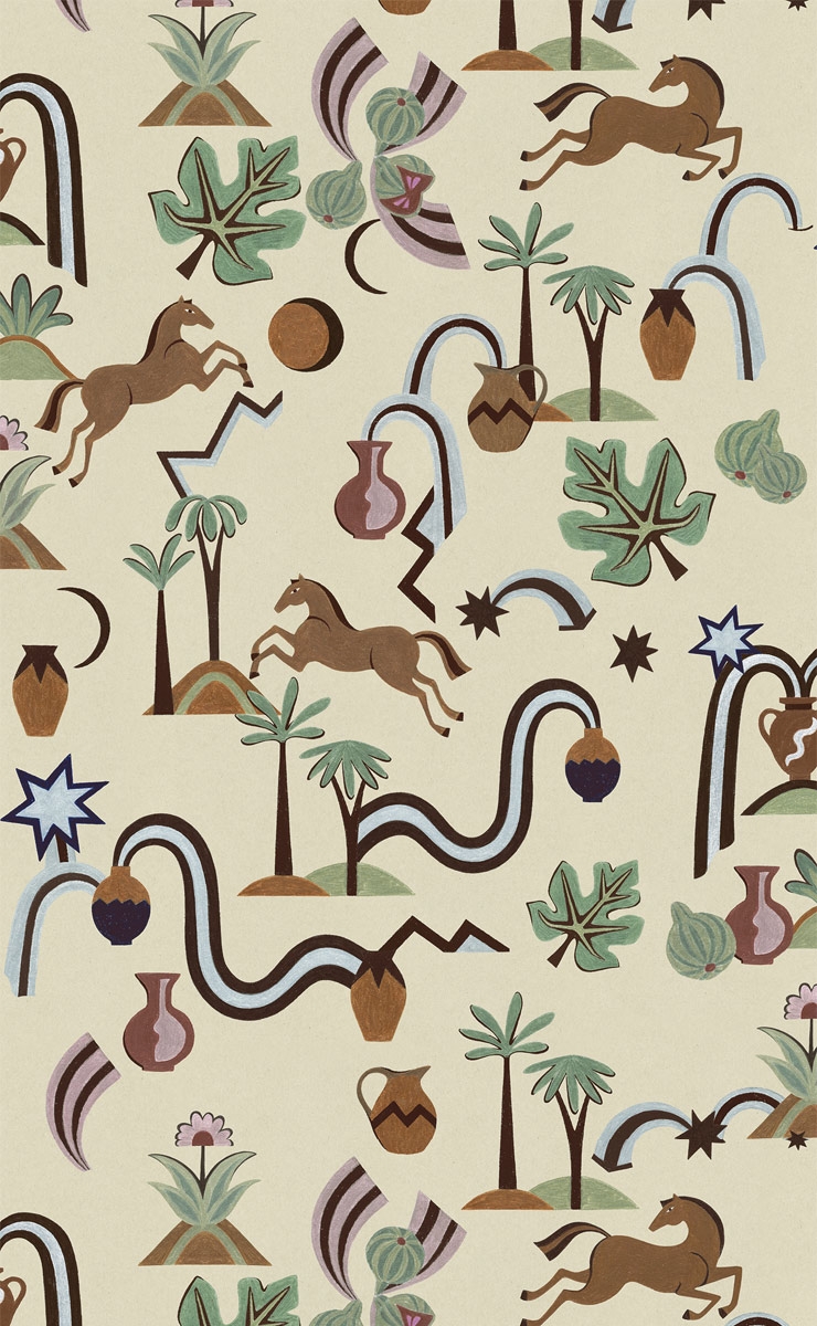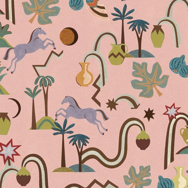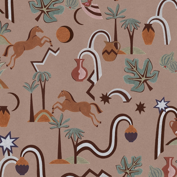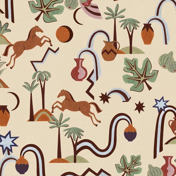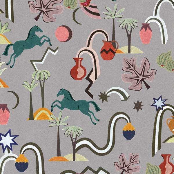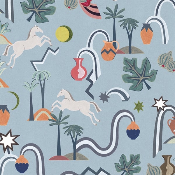 Tres Tintas vous invite à conférer un style audacieux à votre espace de vie à travers le design du papier peint Bot. Des chevaux, des figures curvilignes et des feuilles variées composent le motif multicolore de ce décor mural. Le fond uni de nuance froide apporte une note de fraîcheur à l’ensemble.