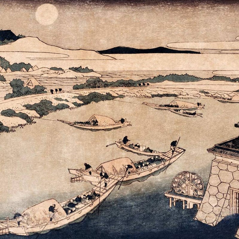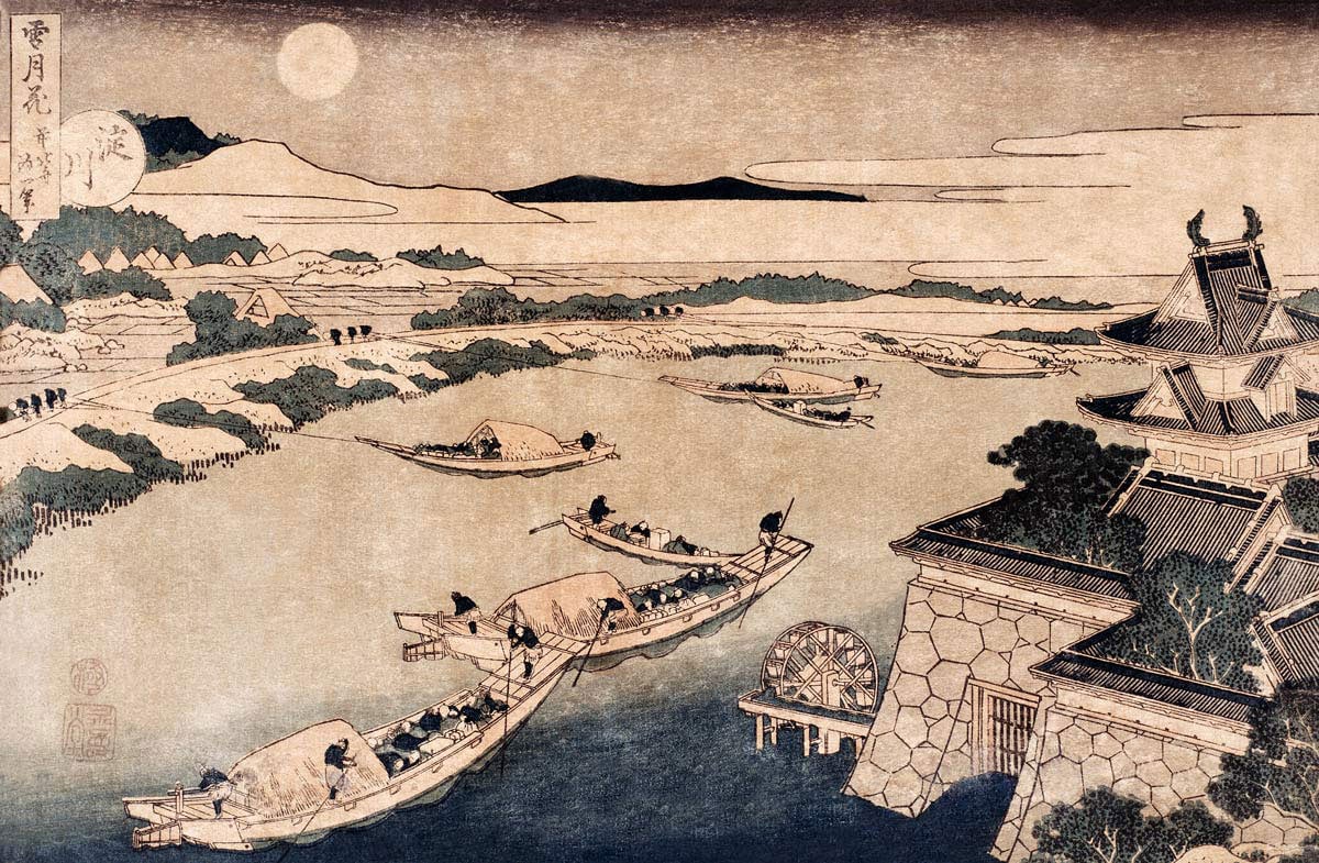 Le panneau mural décoratif La rivière Yudogawa est issu de l'œuvre originale du célèbre peintre et graveur japonais Hokusai Katsushika. Cette estampe tirée de la série Neige, lune, fleurs, réalisée dans les années 1830, représente un paysage sous la lune habité par quelques bateaux sur un cours d'eau et une forteresse. Les dégradés renforcent la sensation de sérénité et de stabilité de l'ensemble.