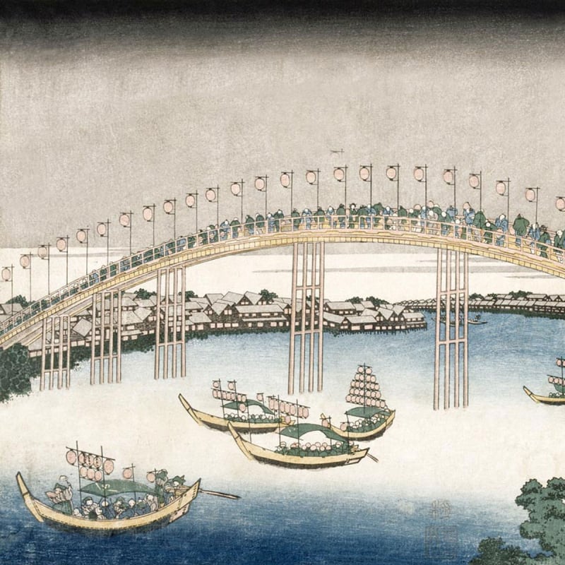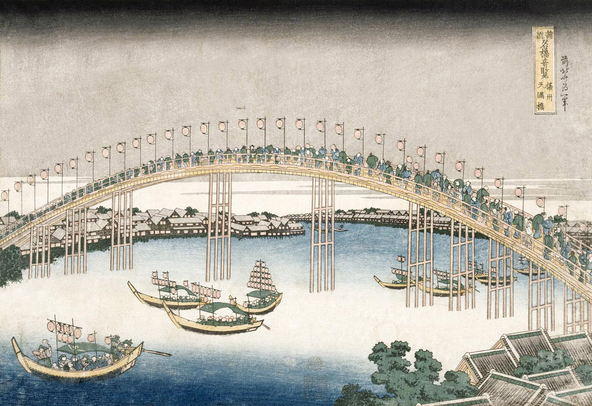 Le pont Tenma dans la province Settsu est une œuvre d'Hokusai Katsushika, le maître ukyio japonais. Conservée au Musée Guimet, Paris, elle est issue de la série de Vues pittoresques des célèbres ponts des différentes provinces et date de 1834. Ce panneau décoratif mural charme par la finesse de ces détails et la douceur de ses dégradés. Le motif est imprimé sur un support haute qualité, certifié Greenguard.