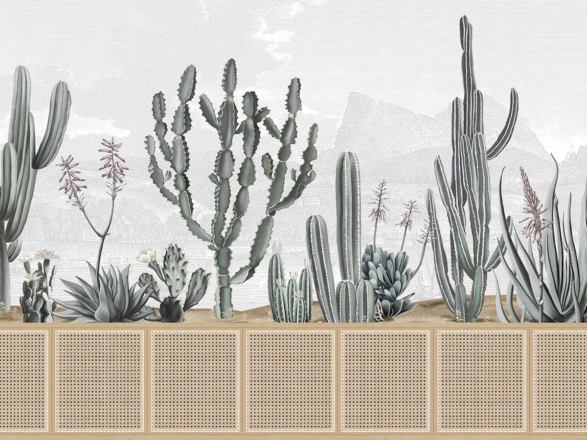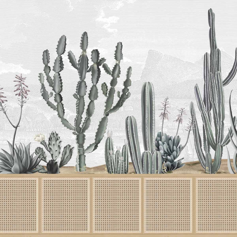 Inspiré du jardin de Pamplemousse du XVIIIe siècle créé par le botaniste français Pierre Poivre, le design du panneau Rose Hill met en avant des cactus et des plantes succulentes originaires de terres arides dans des teintes naturelles. Créant un contraste avec le fond neutre dessinant un paysage dans des nuances sobres, ces éléments apportent une illusion de profondeur et de dimension à l'ensemble.