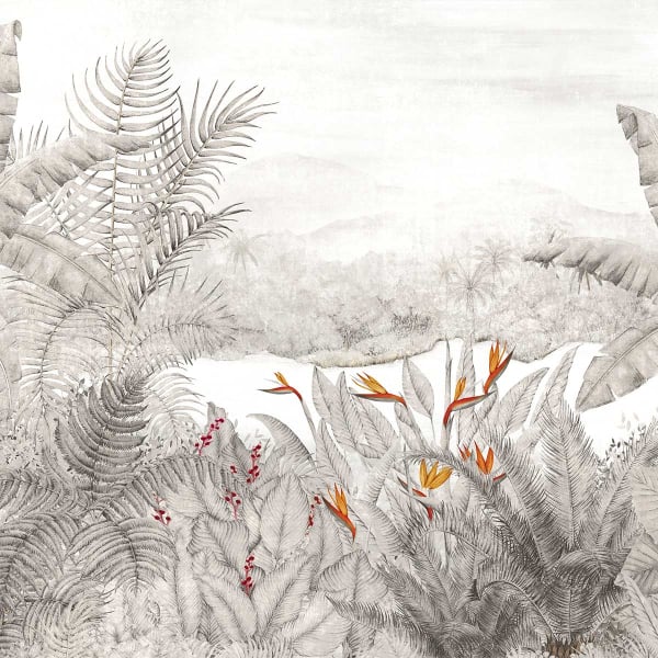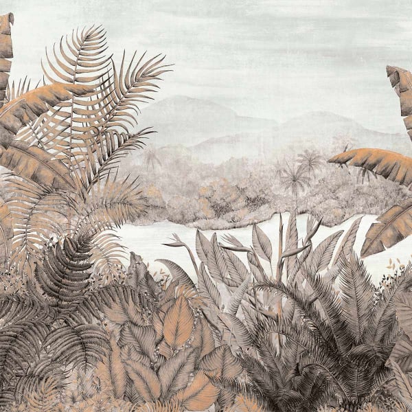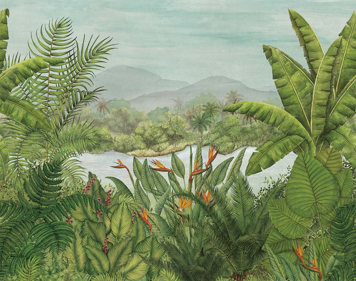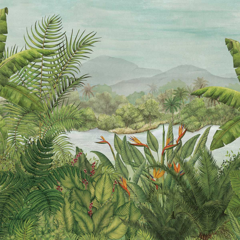 Le panneau Rainforest de Masureel vous plonge instinctivement dans une atmosphère tropicale à travers son design pittoresque. Le motif affiche une pléthore de végétations monochromes décorée par quelques fleurs aux couleurs vibrantes. Au fond, une rivière et des montagnes apparaissent dans une perspective en profondeur. Ce décor mural enchanteur apporte une touche exotique aux espaces de vie.