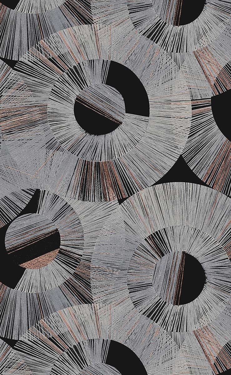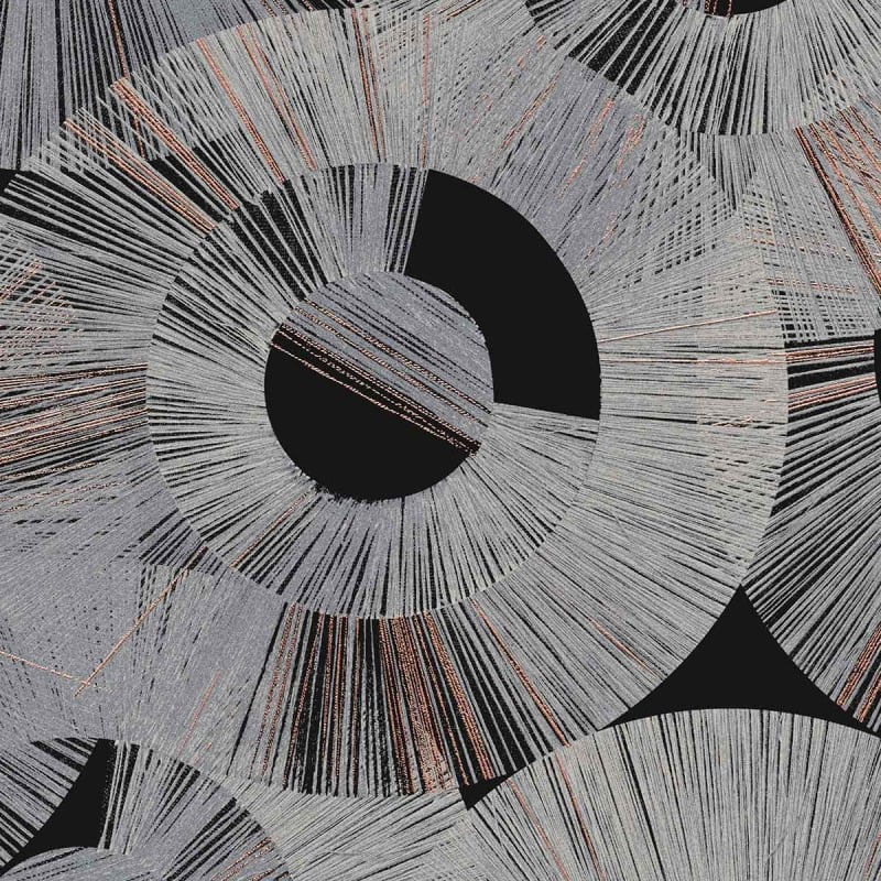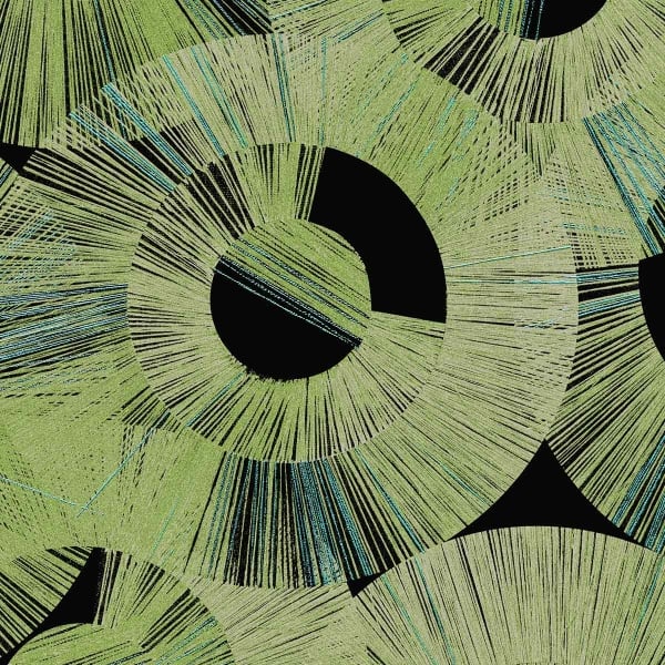 Circum arbore un motif géométrique brodé à la main, constitué de formes circulaires à rayons. Les figures monochromes sont réalisées dans une couleur contrastant avec le fond. Elles se déploient sur un arrière-plan uni en se superposant légèrement, et sont ornées par des nuances plus chaudes par intermittence. Masureel fait usage de matières premières naturelles pour concevoir le motif de ce papier peint.