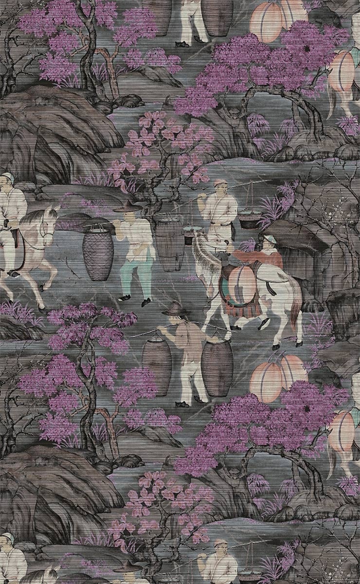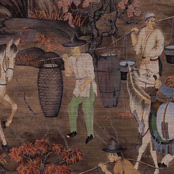 Comme une somptueuse toile de peinture, le motif du revêtement mural textile Toile de Tibet affiche des paysans tibétains qui transportent des vivres et de l’eau. Présentée avec un paysage de roches et d’arbres fleuris, cette scène imaginée par Arte illustre la vie quotidienne de ces personnages dans un choix de couleurs naturelles. Ces mêmes nuances sont accentuées par l’effet patiné du support à l’aspect papier.