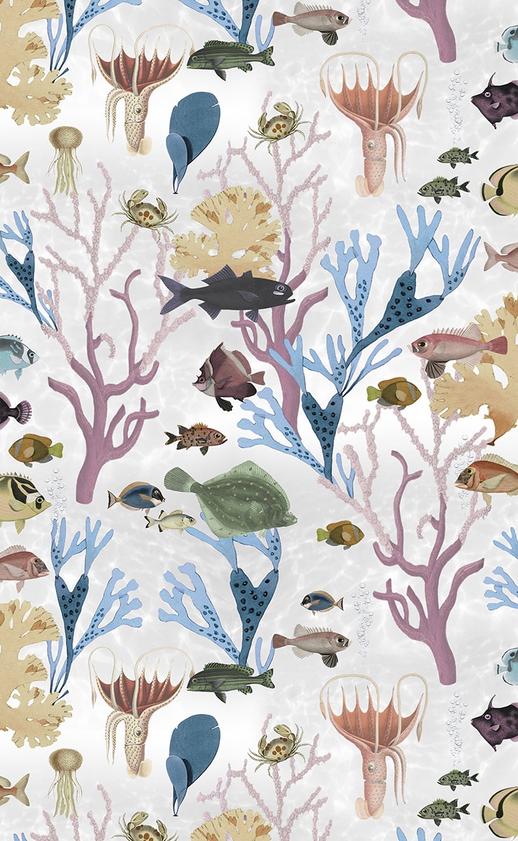 L’océan s’invite dans vos intérieurs avec le papier peint Aquarium. Créé par Rebel Walls, ce modèle révèle une illustration maritime colorée sur un fond clair ou sombre. Le motif se compose de petits poissons, de pieuvres et d’algues flottantes dessinés dans des tons naturels. Ce thème aquatique apporte une touche rafraîchissante aux intérieurs.