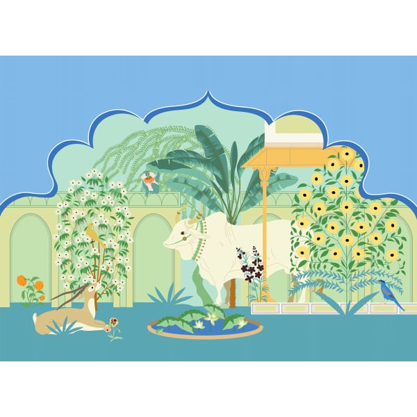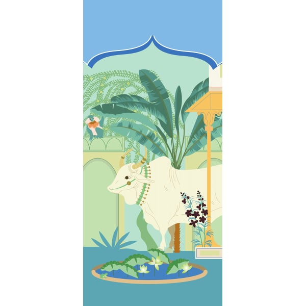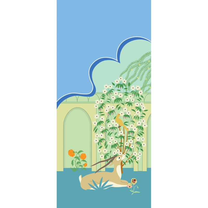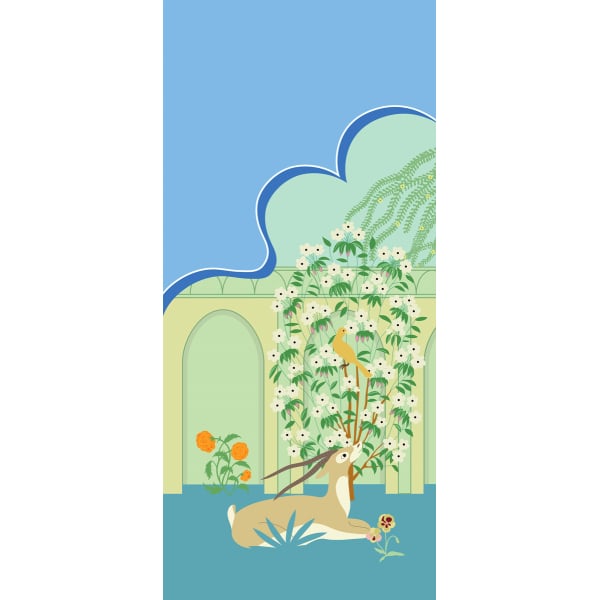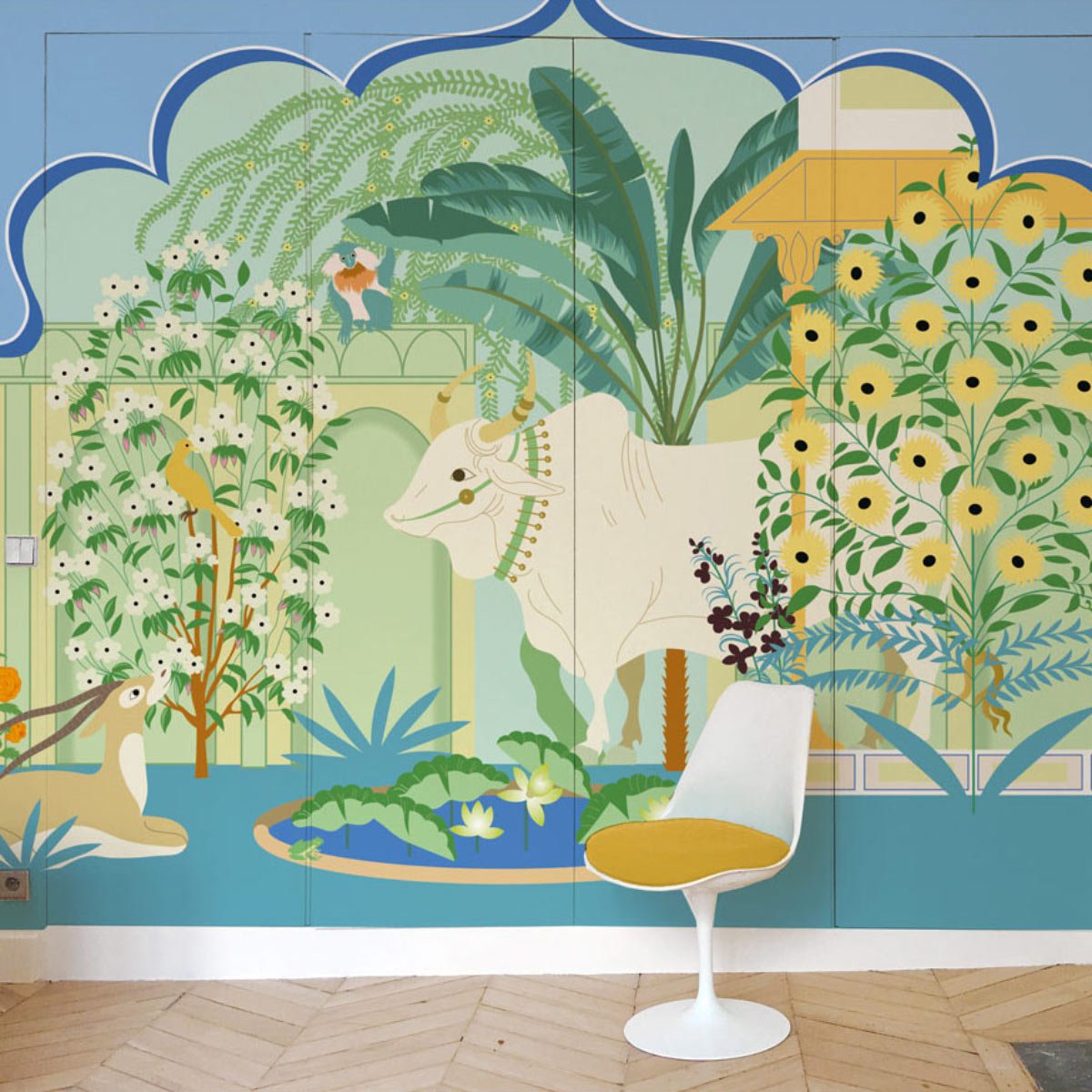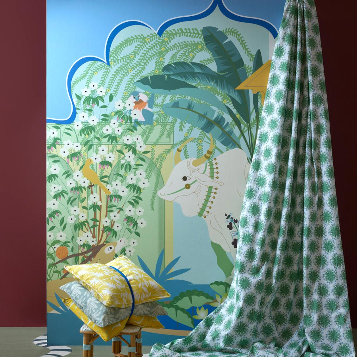 Influencés par les décors indiens, les designers de Little Cabari imaginent pour le panoramique Prithvi Mata Bleu un visuel coloré mettant en scène différents animaux dans un somptueux patio. Entourés de végétation et sous une arche sinueuse rappelant les architectures orientales, ils sont représentés dans des coloris vifs dominés par un bleu saisissant. Ce revêtement mural confère une note chaleureuse et exotique aux espaces.