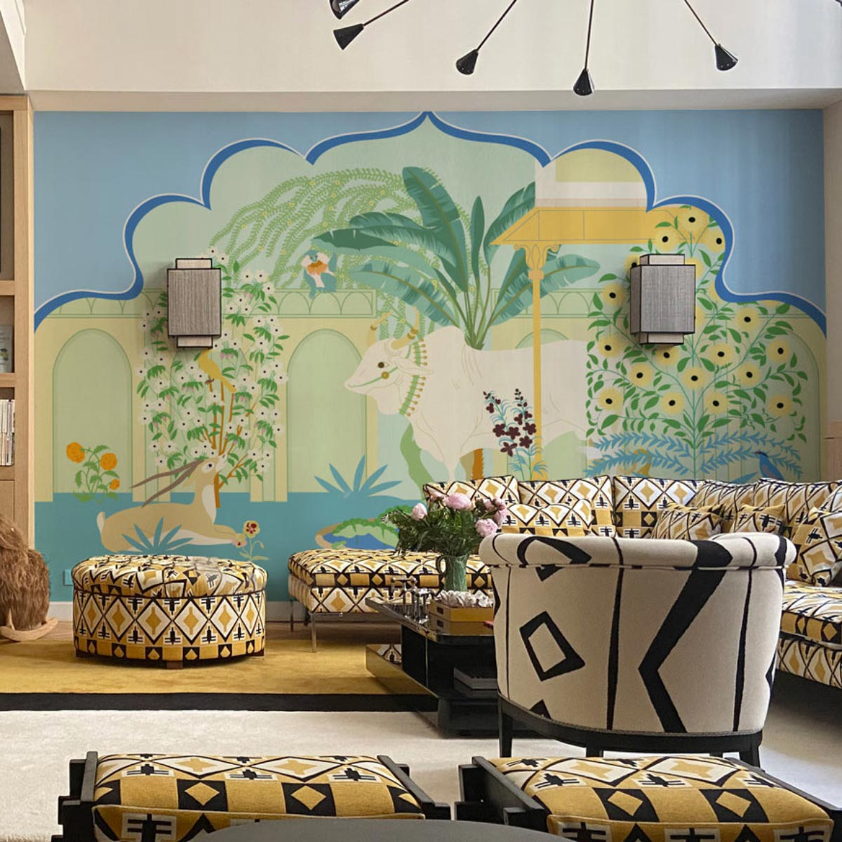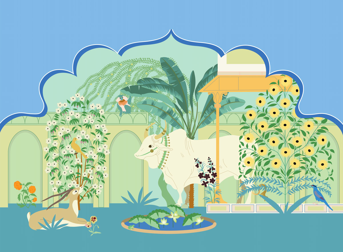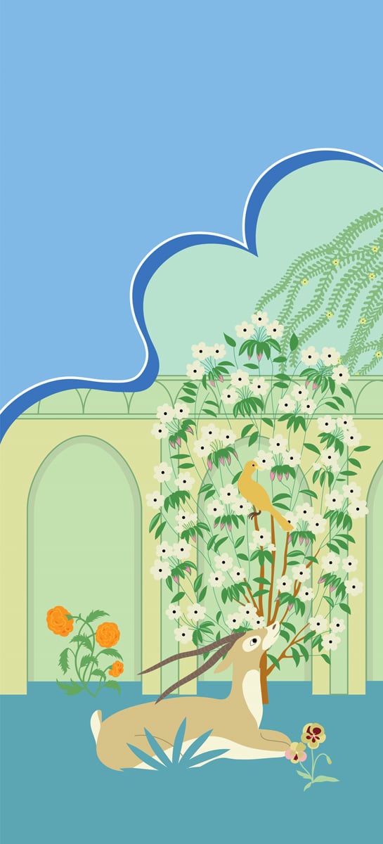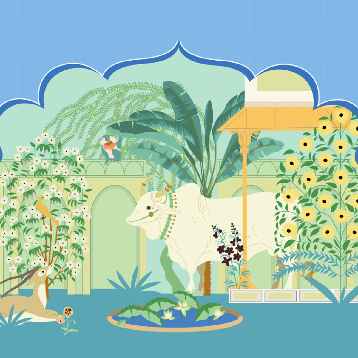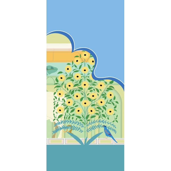 Influencés par les décors indiens, les designers de Little Cabari imaginent pour le panoramique Prithvi Mata Bleu un visuel coloré mettant en scène différents animaux dans un somptueux patio. Entourés de végétation et sous une arche sinueuse rappelant les architectures orientales, ils sont représentés dans des coloris vifs dominés par un bleu saisissant. Ce revêtement mural confère une note chaleureuse et exotique aux espaces.