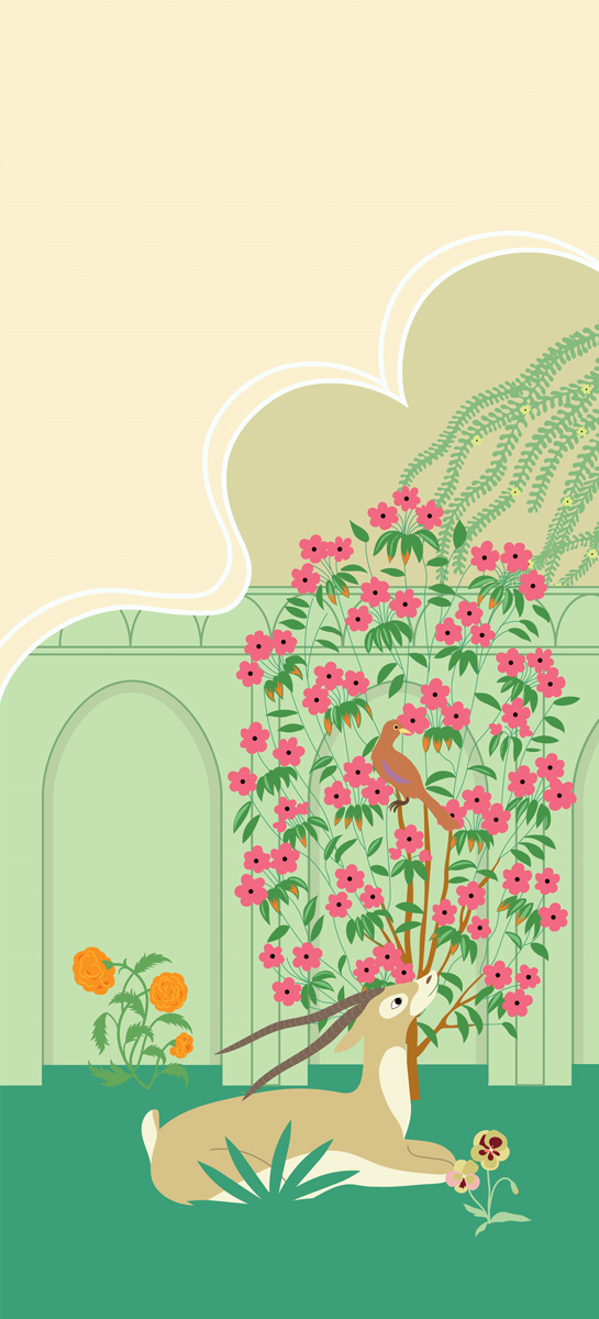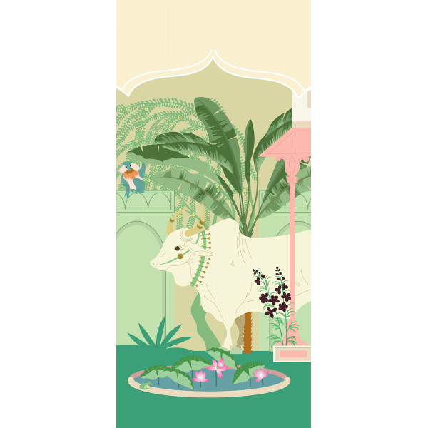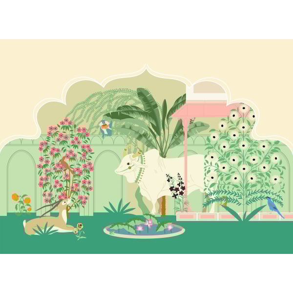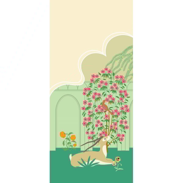Inspiré des décors indiens, le motif coloré du panoramique Prithvi Mata Rose représente un jardin de fleurs abritant une antilope, un singe et un taureau. Il met en avant une végétation dans des teintes vives et douces, conférant une note orientale et exotique aux intérieurs. Ce revêtement mural proposé par Little Cabari convient aux chambres d’enfants.