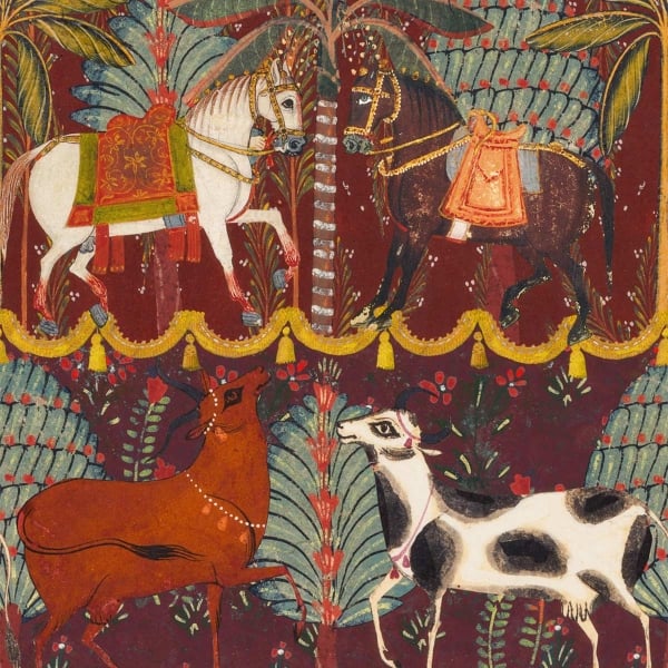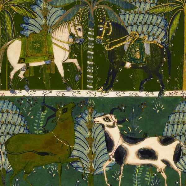 Un sentiment d’allégresse et de liberté se dégage du panneau Carnaval. Il met en avant une scène festive où chevaux et bétails se pavanent parmi les fleurs aux feuillages exotiques. Des éléphants ornés de guirlandes et de tapisseries brodées viennent compléter ces dessins. Ce revêtement mural signé Mindthegap est décliné dans une combinaison de couleurs vives pour donner vie au décor.