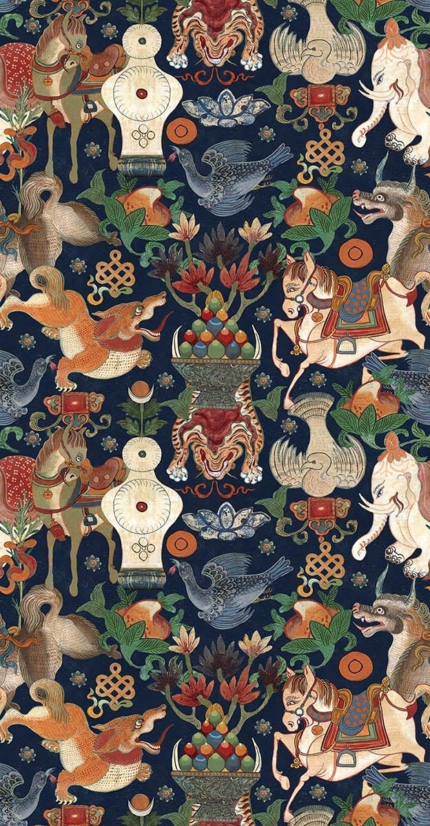 Le panneau Incantation met en scène un monde mystique où créatures imaginaires se mêlent à des fleurs exotiques et des figures architecturales complexes. Sur son fond monochrome sombre ou clair se dressent des oiseaux surréels, des éléphants majestueux et des animaux mythiques ressemblant à s’y méprendre à des dragons. Ce décor mural imaginé par Mindthegap éveille les sens avec son mélange de couleurs vives.