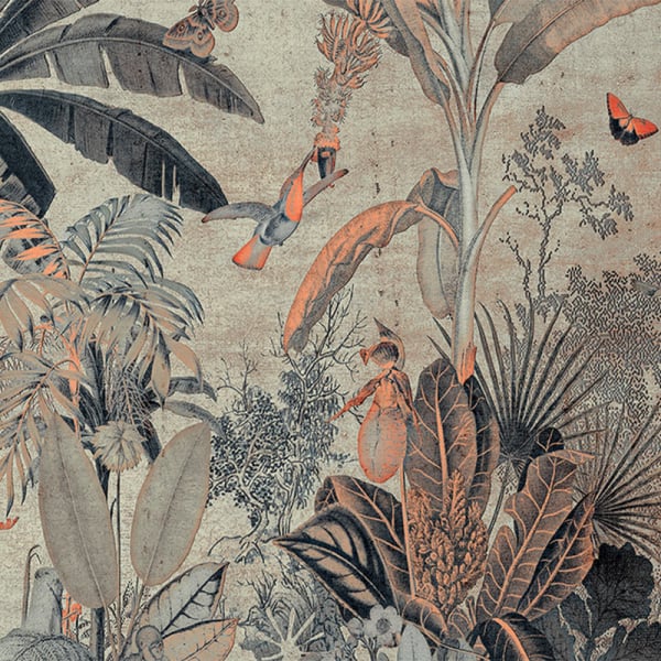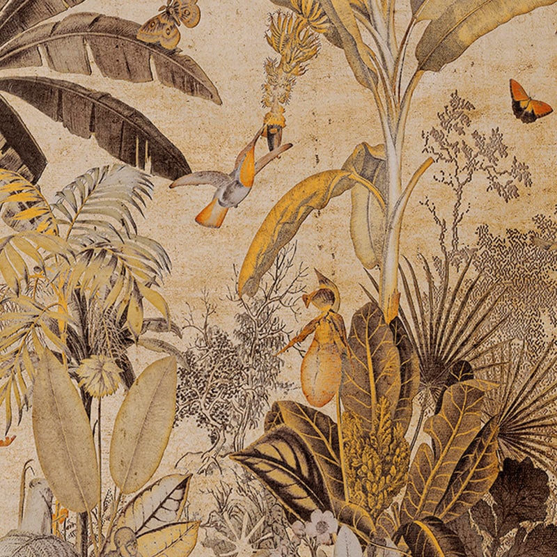 Le panneau Milk and Honey raconte un paysage onirique prenant place au Pays de Cocagne, une contrée imaginaire de contes. La scène dépeint des colibris, des perroquets et des singes vivant en harmonie au milieu d’une végétation luxuriante. Les tonalités empruntées confèrent une note de chaleur et de profondeur au dessin. Imprimé sur du papier parchemineux, ce panorama décore les intérieurs d’une touche vintage.
