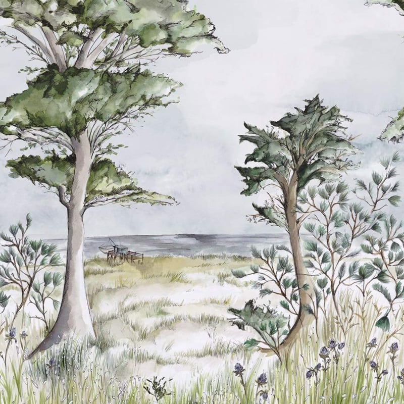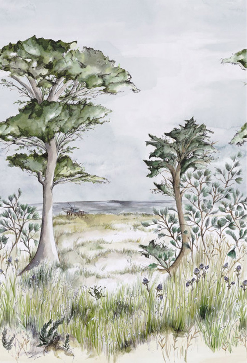 Le papier peint panoramique Pornic met en scène un paysage littoral qui inspire au voyage et à l’escapade. Cette illustration représente des herbes folles et des arbres, précédant une cabane de pêcheur sur pilotis qui donne sur la côte atlantique. Ce tableau est pensé pour retranscrire la sensation atmosphérique de l’environnement, et décorer les intérieurs d’une note exotique pleine de fraîcheur.