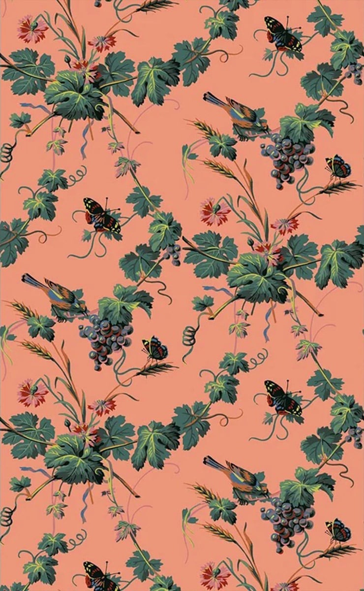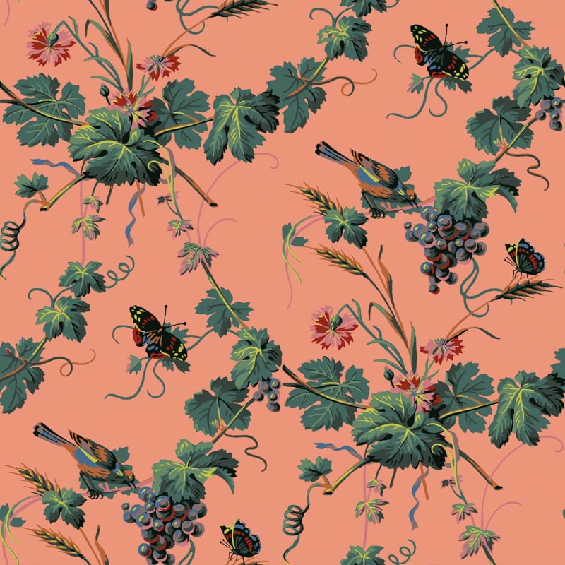 La manufacture Hubert et Dinan imagine ce design en 1801. Cette effusion colorée est proposée par Papier Français. La Treille aux Oiseaux, c’est une rencontre entre de malicieux volatiles et de fantasques papillons. Cette scène se déroule dans une vigne chargée de raisins et de fleurs. Toute la richesse des détails et la profondeur des couleurs sont ici retranscrites.
