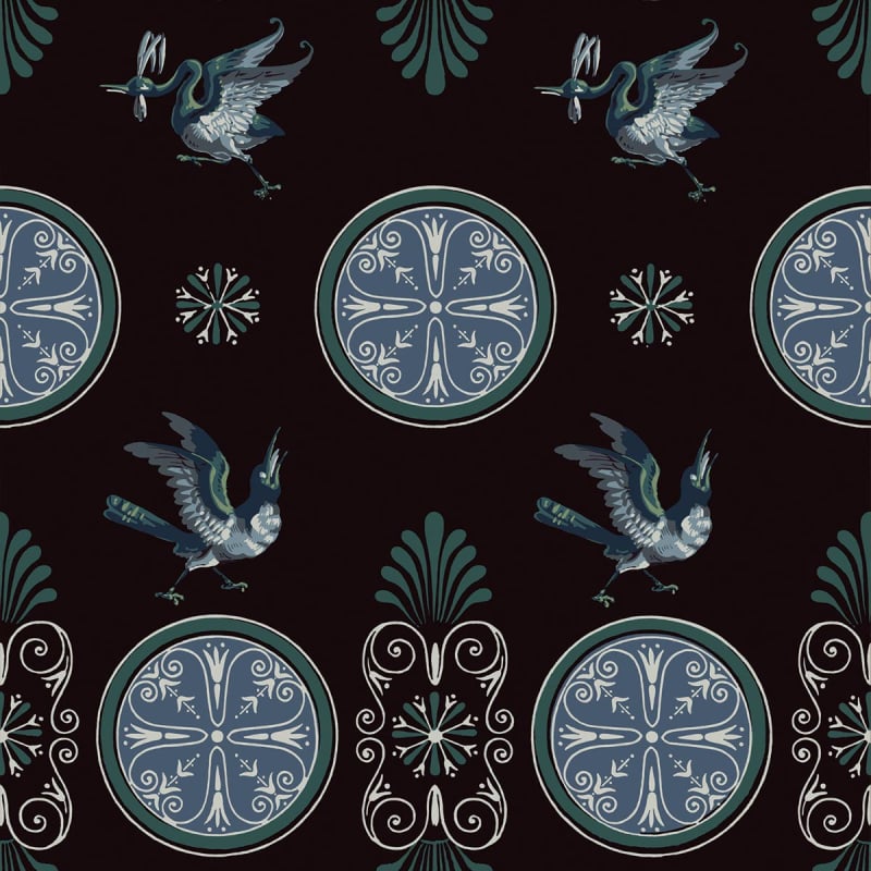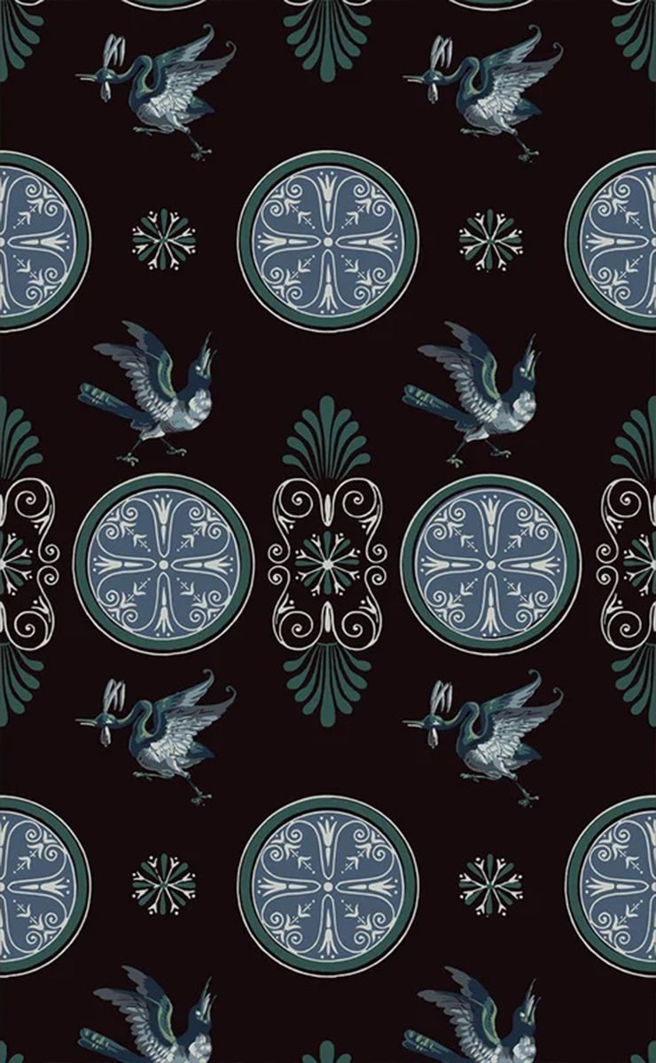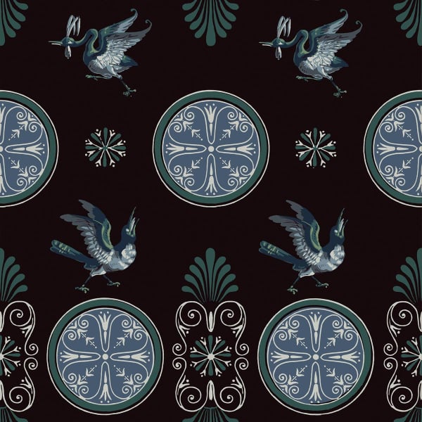 Ce modèle est imaginé en 1799 par la manufacture Simon. Aujourd’hui, il renaît grâce au savoir-faire de Papier Français. Sur un fond plus sombre, apparaît des motifs vintages ainsi que de malicieux oiseaux. Ses teintes de vert et de bleu sont à la fois doux et décoratives. Les courbes du dessin sont un appel à la poésie.