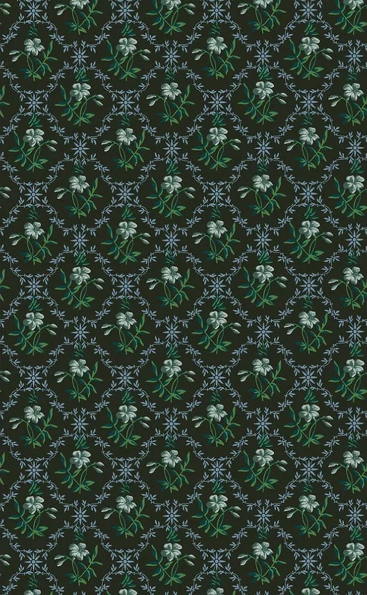 Papier Français sublime un design datant de 1799. Un motif végétal recouvre un fond sombre, ce qui lui confère un aspect mystique. Une myriade de fleurs de Verveine l’habille de sa fraîcheur. Cette plante aux nombreuses vertus était autrefois sacrée et vénérée par les druides. Une aura mystique enveloppe donc cette proposition.