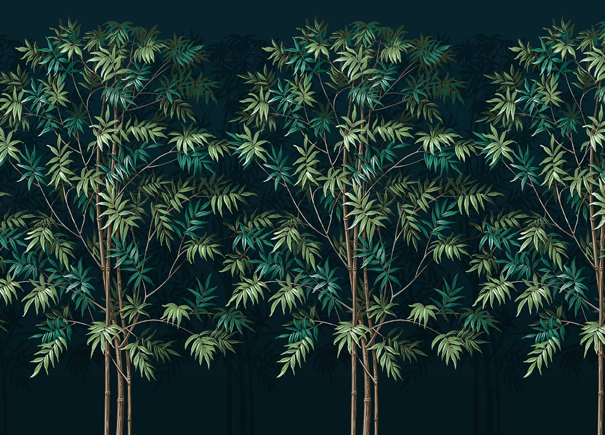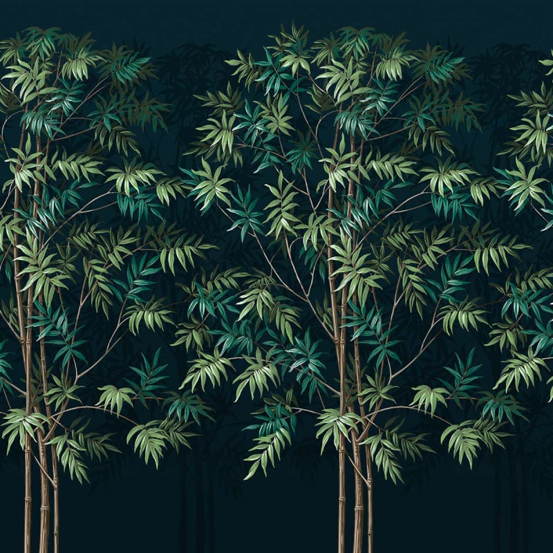Mythical installe dans les intérieurs une scène majestueuse de plantes feuillues. Ce décor mural à finition brillante, signé Coordonné, est conçu en soie. Il présente une forêt de bambous aux cannes longilignes qui se déploie sur un arrière-plan de ton sombre donnant de la profondeur au design et aux murs. Un rayon de soleil subtil laisse son éclat sur les feuilles, rehaussant leurs teintes naturelles.