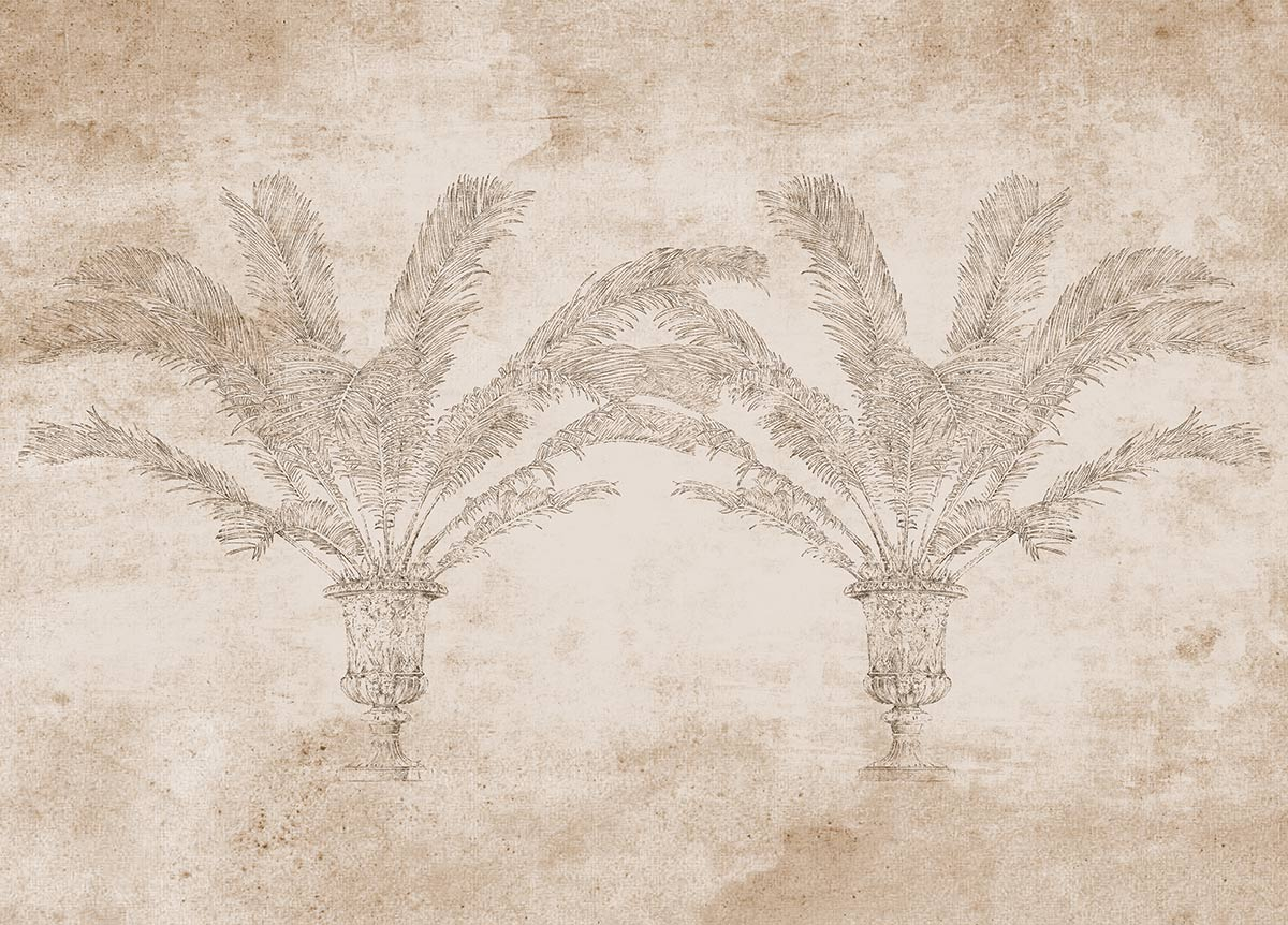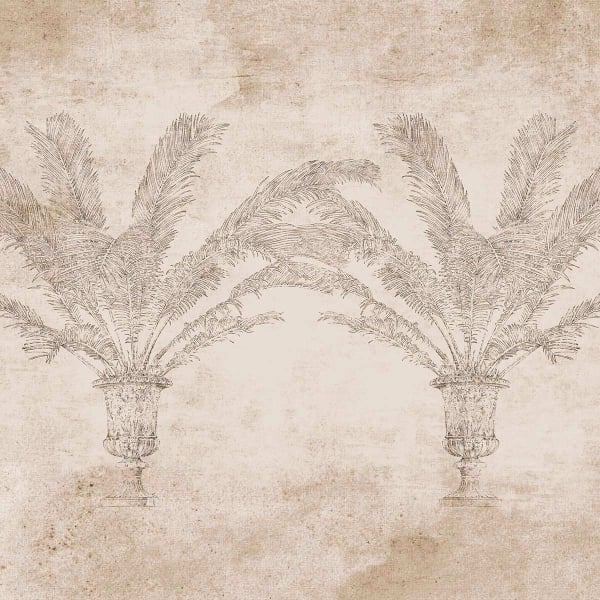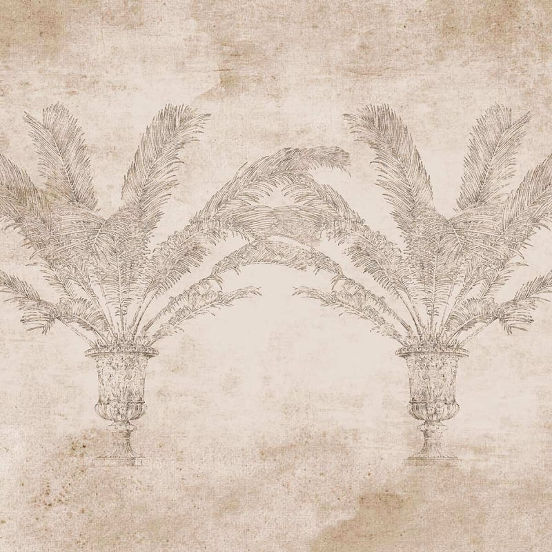 Empreint d'esthétisme et de sobriété, le design de Palma décore les murs d’une note vintage. Ce revêtement mural conçu en soie arbore un motif de palmiers poussant dans des jarres antiques. L’arrière-plan ouvert adopte une apparence vieillie, crayeuse et ornée de traces patinées. Cette illustration est inspirée d’Athènes et de ses entrées scéniques.