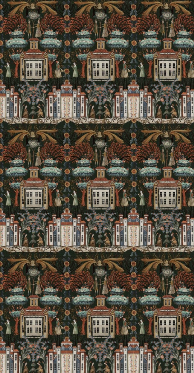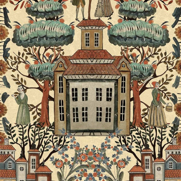 Le papier peint Tales of Tyrol transforme les murs en une merveilleuse fresque avec son design classique. Il affiche une scène fantastique où l'architecture tyrolienne et les habitants du village se réunissent sous une voûte de feuillages. Les personnages sont vêtus de manière traditionnelle rehaussée par les couleurs terreuses et chaleureuses.