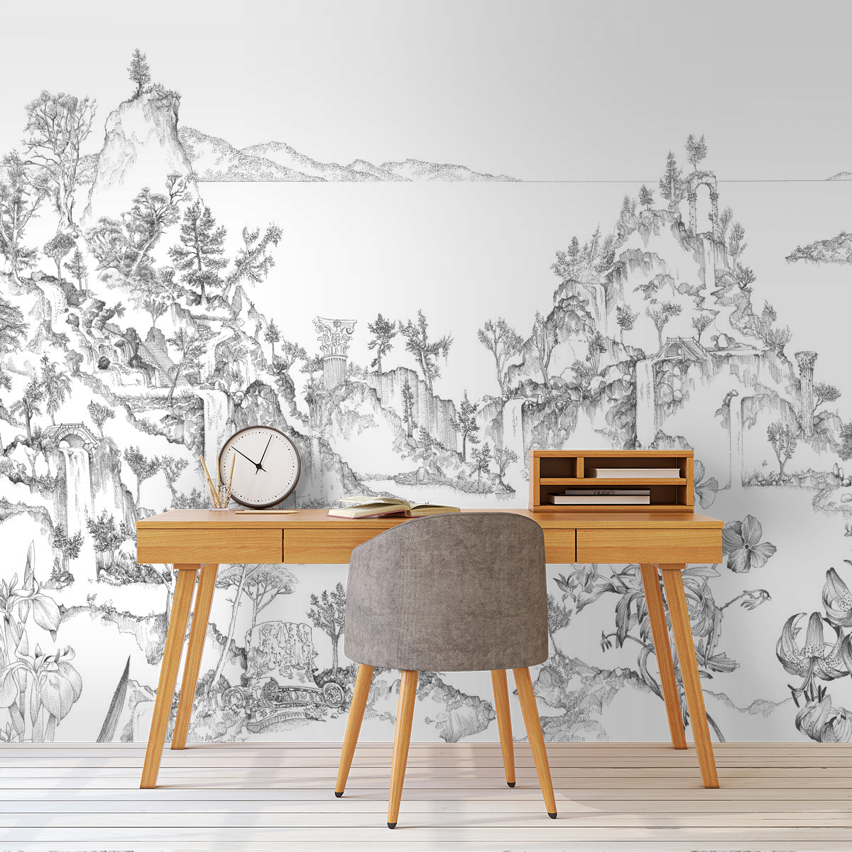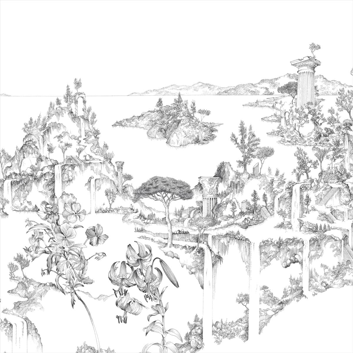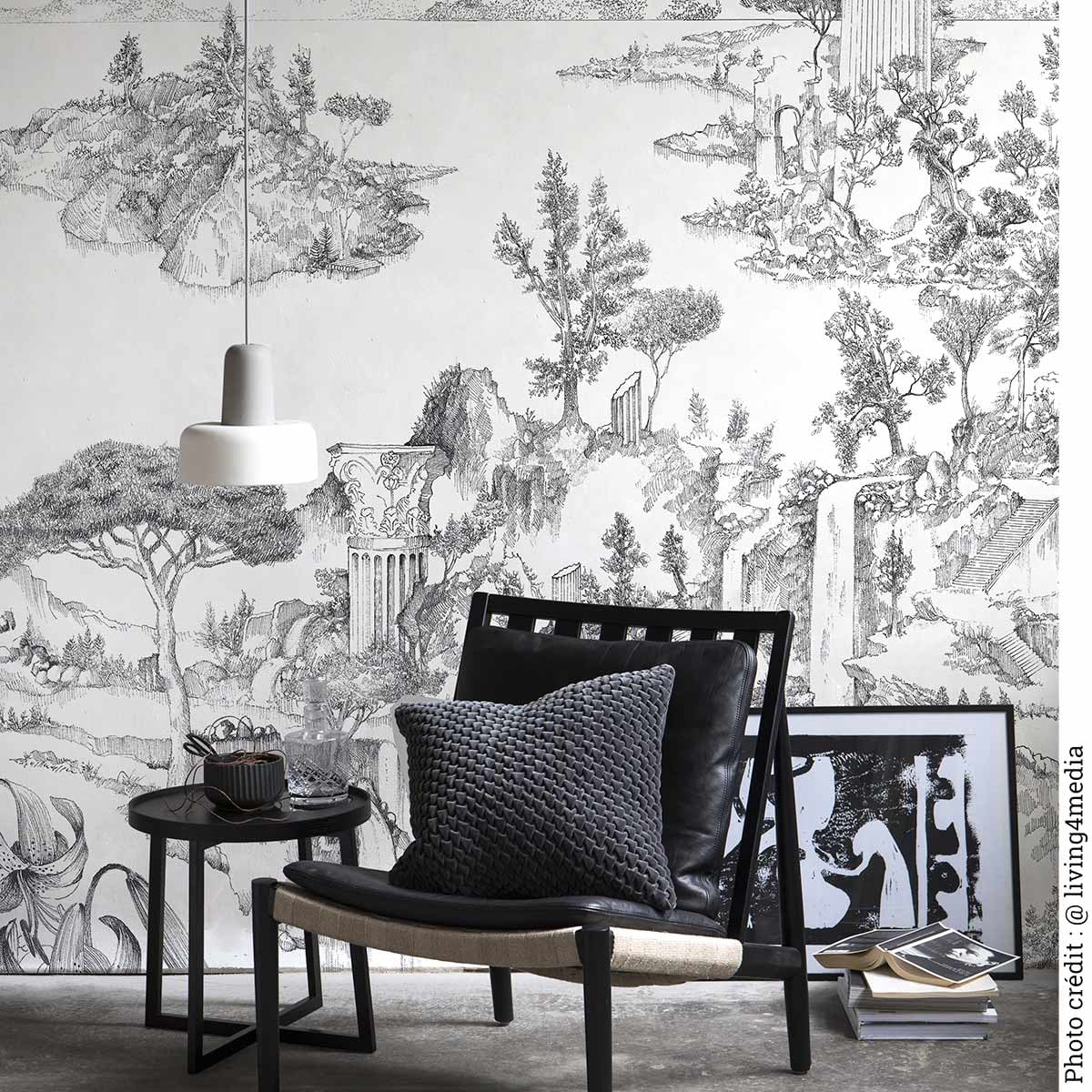Invitant à la contemplation, le papier peint panoramique Cité Rêvée est originalement dessiné avec finesse et précision par l’artiste Octave Marsal. Mêlant des éléments architecturaux de différentes ères, il imagine pour Isidore Leroy un univers onirique fascinant.  Laissant apparaître tous les tracés de sa composition, ce revêtement instaure une atmosphère relaxante et poétique aux espaces de vie.