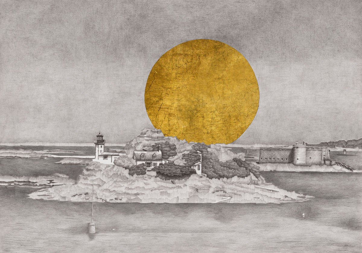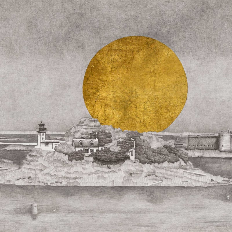Surplombé d’une majestueuse lune jaune safran, le motif du papier peint panoramique Nouvelle lune sur Louet révèle un paysage marin minutieusement dessiné à l’encre par l’artiste française Catherine Prigent. Représentant le flanc d'un petit îlot breton, cette création aux allures de gravure offre aux espaces de vie une dimension poétique et relaxante.