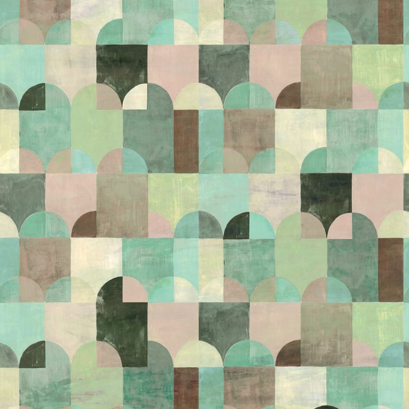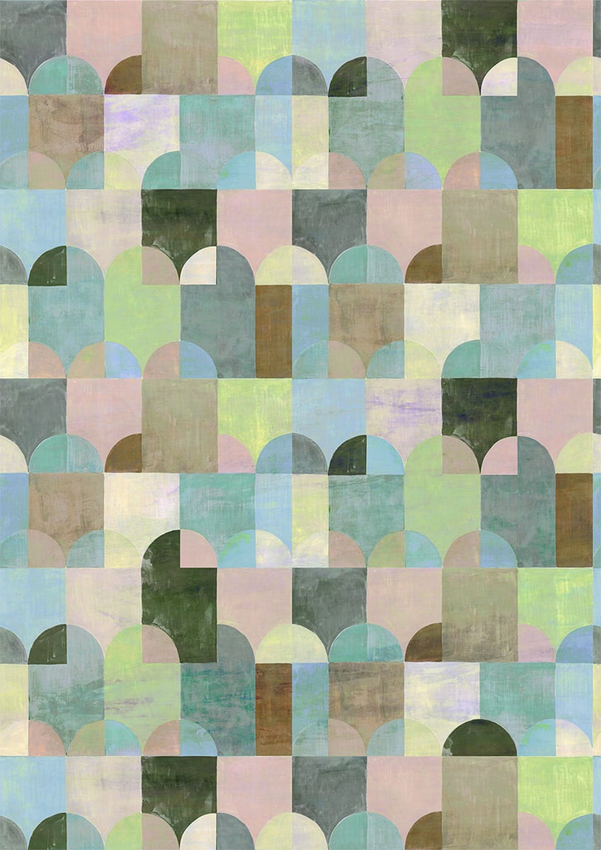 Proposé par Masureel, Arc est un papier peint panoramique au design contemporain empruntant le style de Sobborgo. À travers un tableau abstrait se dessine un village dont les maisons et les arbres sont retranscrits par des figures géométriques. L’ensemble est réalisé dans un choix de couleurs d'argiles et pastels, rehaussé par une finition texturée obtenue par l'utilisation d'encre gonflante.