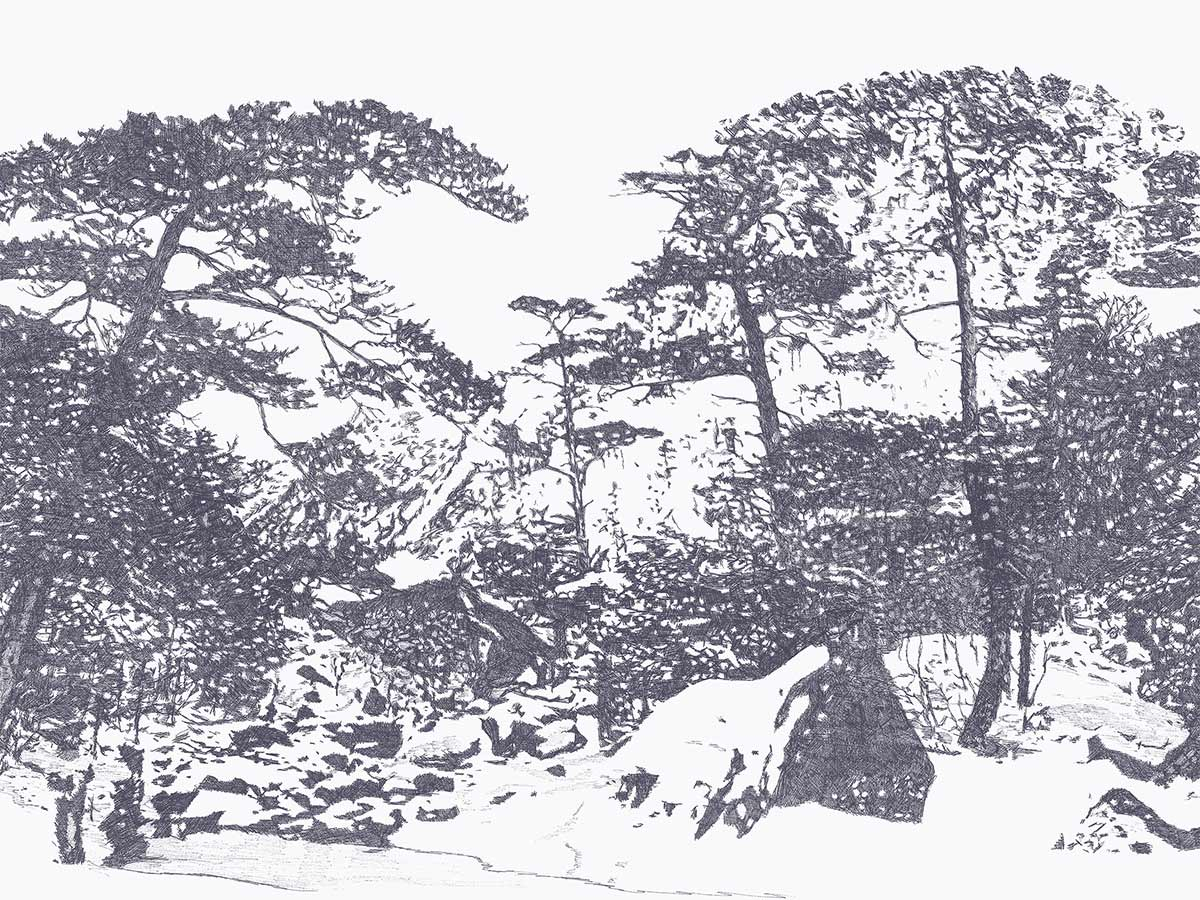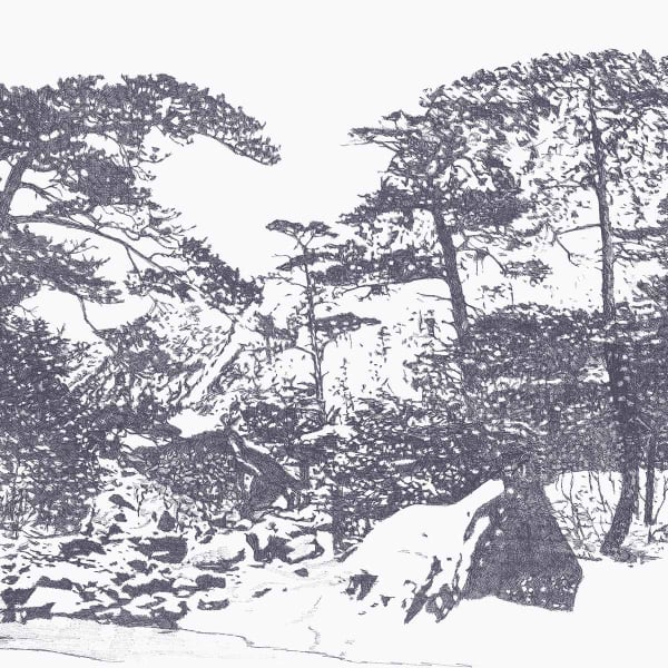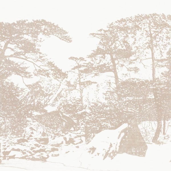 Ce papier peint panoramique Ginkesai arbore un spectaculaire paysage sous la neige. À première vue, cela pourrait presque ressembler à une photographie mais en regardant de plus près, le geste de la main de l'esquisse est perceptible. Son dessin de grande envergure habite toute pièce et se présente comme une fenêtre vers un ailleurs lointain.