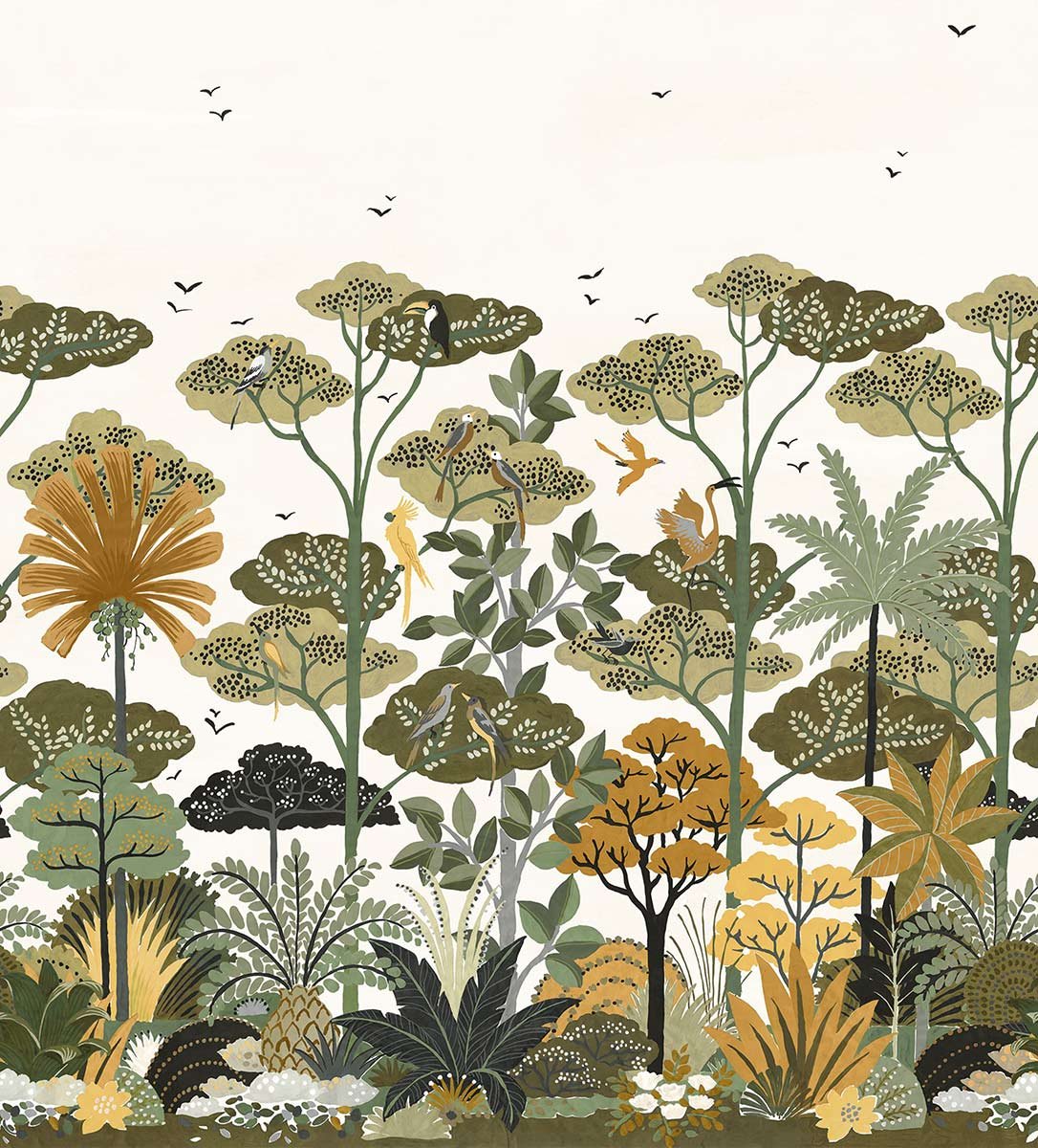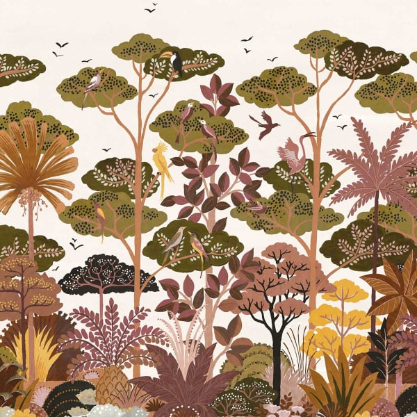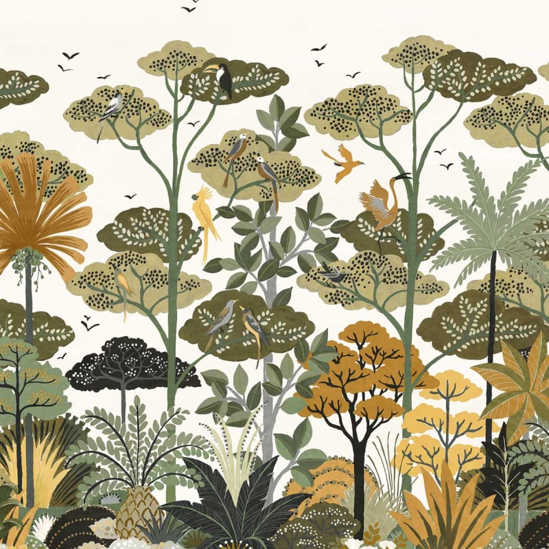 Créé par Casamance, le papier peint panoramique Kandy invite à une promenade enchanteresse à travers le jardin éponyme au Sri Lanka. Il dépeint un tableau végétal où une plantation luxuriante se révèle par une infinité de couleurs. Des toucans et des flamants roses se mêlent parmi les bananiers, les cocotiers et les frangipaniers. Les oiseaux voltigeant dans le ciel ouvert complètent cette scène exotique qui invite à l’évasion.