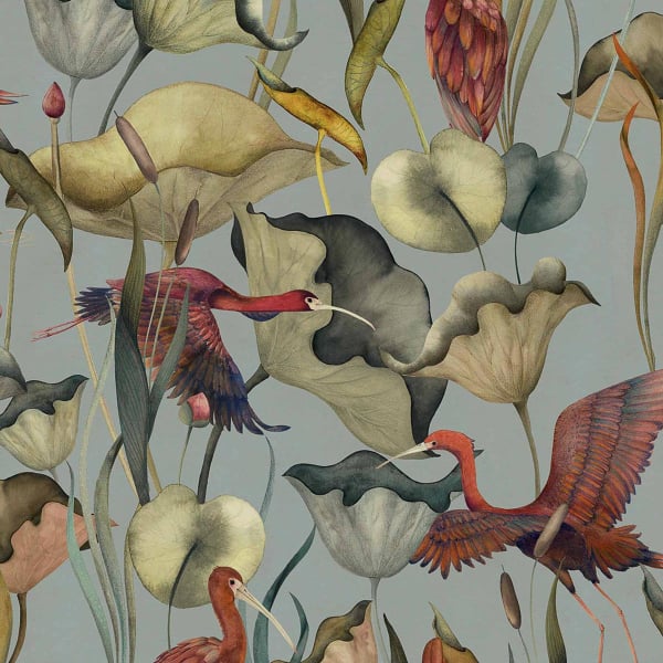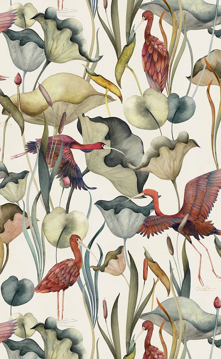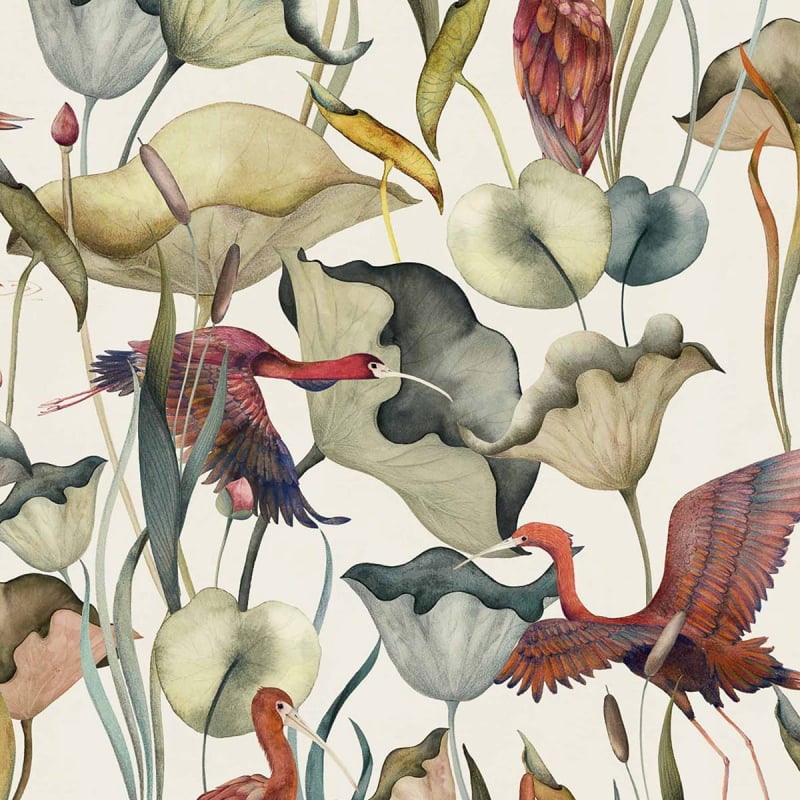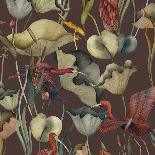 Le papier peint Humedales capture la grâce de la nature à travers son motif floral de style artistique. Présentée par Coordonné, cette création affiche un paysage bucolique où l’on voit des ibis jouant parmi les nénuphars et les lotus. Le dessin emprunte une coloration profonde et intense, et prend vie sur un fond sombre ou clair selon la déclinaison. Ce jardin luxuriant arbore un air exotique.