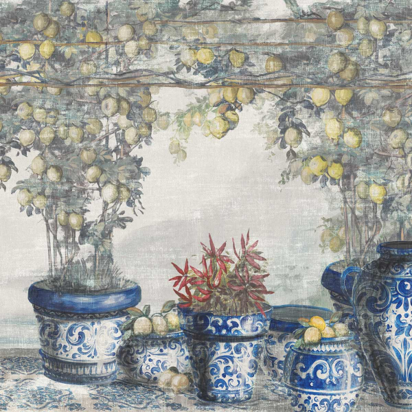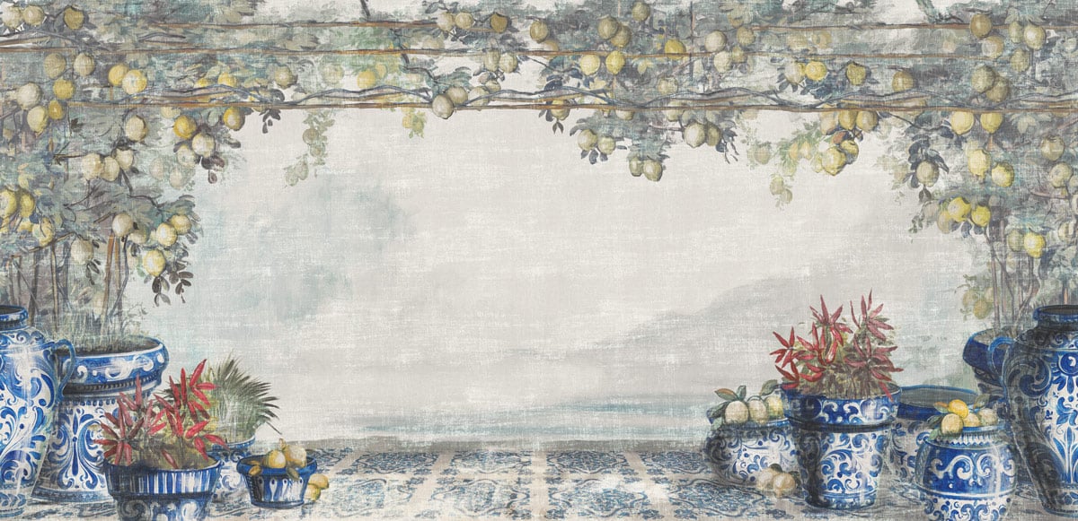 Célébrant la richesse culturelle de l’Italie à travers le revêtement mural Sorrento, le designer Gio Bressana imagine cet espace extérieur enveloppé de branchages de citronniers et de pots en céramique traditionnelle. Comme une invitation au voyage, cette création Inkiostro Bianco se décline en plusieurs variantes.