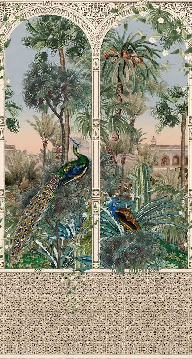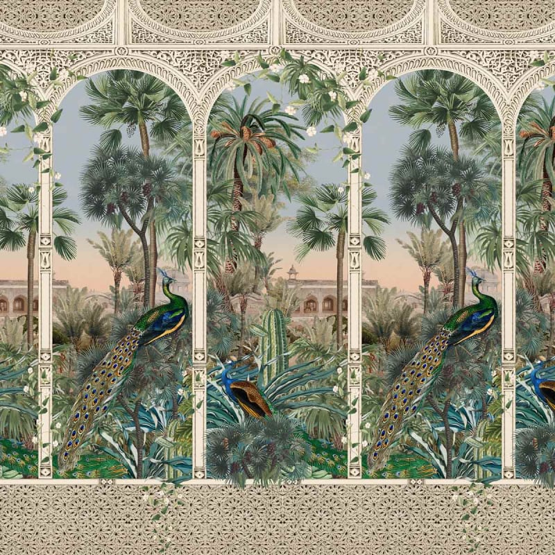Proposé par Mindthegap, le papier peint panoramique Erfoud habille les murs d’une illustration presque réaliste. Il met en avant un Riad, un édifice emblématique de la région marocaine, qui séduit par sa beauté architecturale. Cette construction donne sur un jardin luxuriant empli de verdure et décoré par des paons au plumage majestueux.