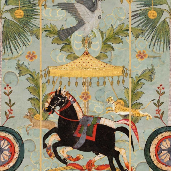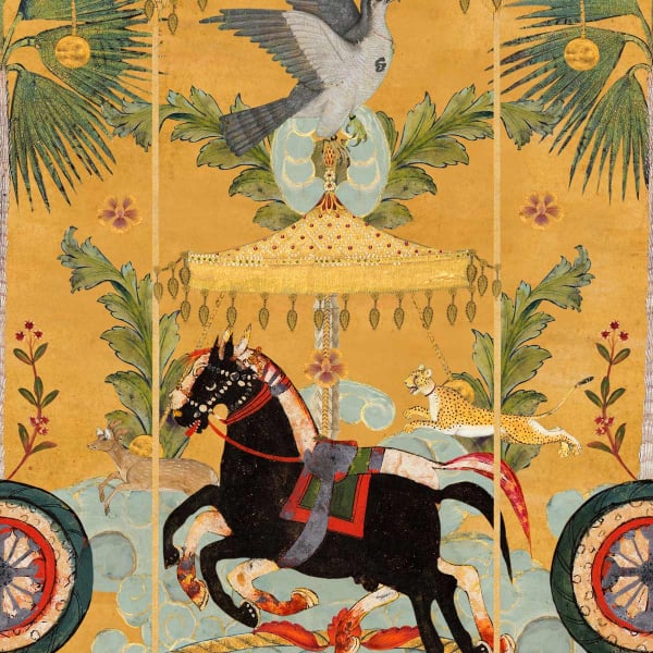 Yennayer plonge les intérieurs dans une atmosphère féerique avec son design. Ce papier peint signé Mindthegap dévoile une scène festive vibrante où des chevaux cabrés, des oiseaux et d’autres animaux sauvages s’amusent à travers des architectures décorées. Ce tableau illustre la célébration du Nouvel An dans la région maghrébine, et apporte un souffle de dynamisme aux intérieurs. La composition coloristique se veut terreuse pour un effet naturel et une ambiance conviviale réussie.