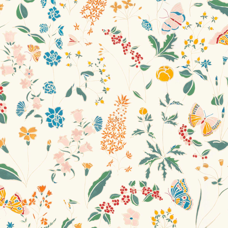 Apportant une touche joyeuse et printanière dans vos espaces, le motif du papier peint Josepha dessine un ensemble de fleurs variées visité par d’adorables papillons colorés. Cette composition graphique est originalement dessinée par l’artiste française Claire de Quénetain.