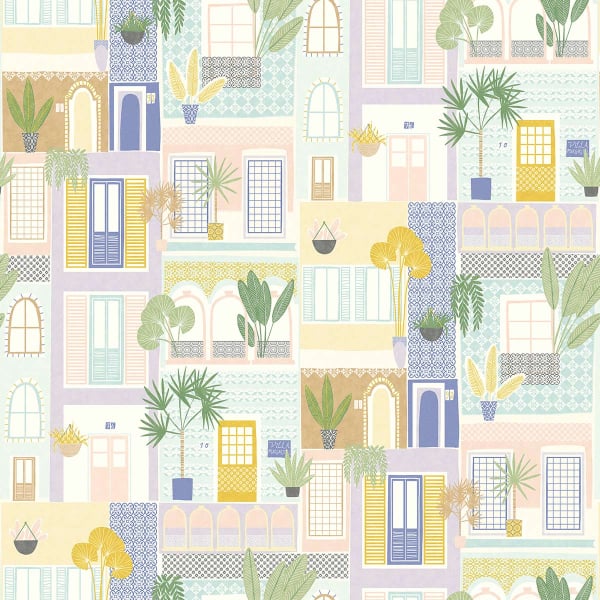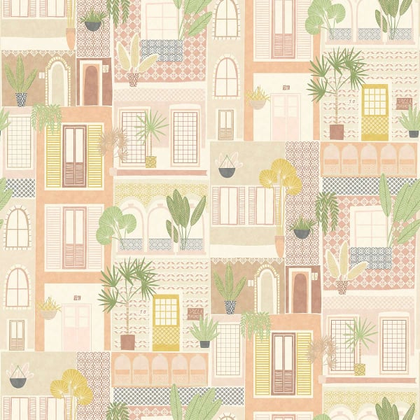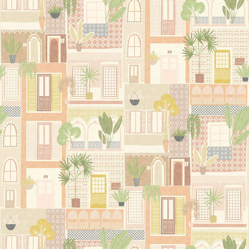 Le décor mural Cityscape Delight Big présente un design captivant inspiré d'une ville animée. Les façades des maisons, avec leurs portes et fenêtres variées, sont ornées de motifs géométriques et embellies par des plantes. La coloration est soigneusement composée de nuances douces et pastel, créant une atmosphère chaleureuse et apaisante. Ce papier peint panoramique évoque une ville baignée d'une lumière douce et invite à la détente et à la contemplation.
