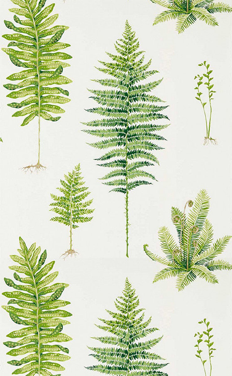 Le papier peint Fernery de la maison Sanderson célèbre la beauté de la nature avec son motif végétal raffiné. Les formes de feuilles diverses et caractéristiques ainsi que les frondes délicates sont représentées avec précision, créant une véritable oasis de verdure sur les murs. La coloration du motif, dans des teintes naturelles et vives, contraste harmonieusement avec le fond uni, ajoutant une touche de vie et d'énergie aux espaces.