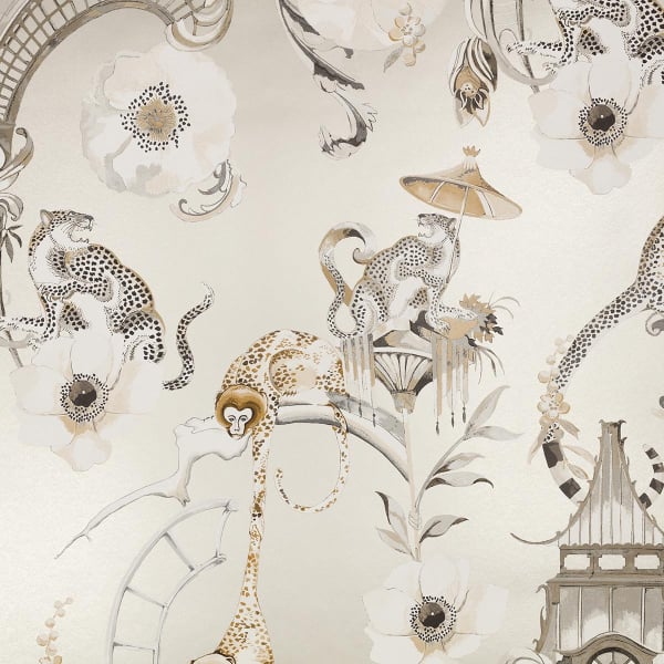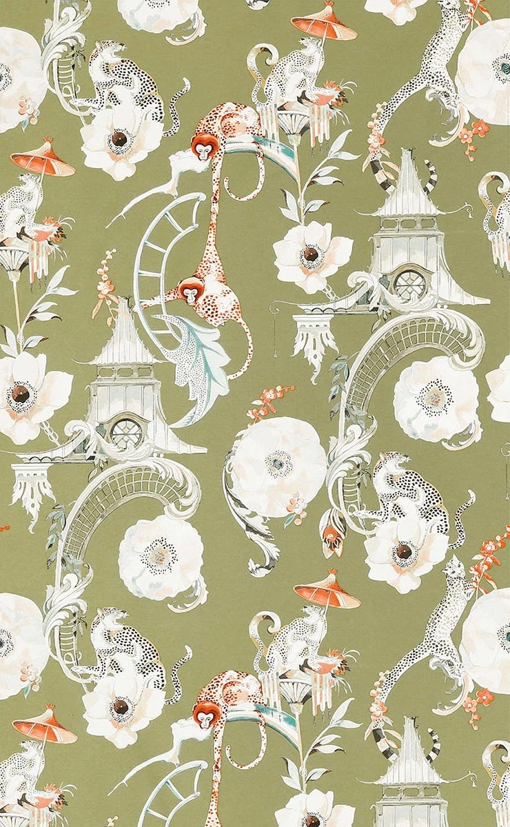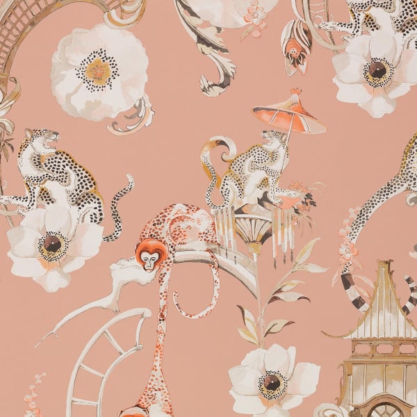 Romo propose une ambiance ludique avec le papier peint Euphoria. Le motif, originellement peint à la main par la créatrice Alice Temperley, montre un jardin chinois animé par des singes et des léopards. Les primates se balancent en hauteur, tout près des fauves rugissants. L’ensemble, dépeint dans de riches nuances de couleur, invite à la bonne humeur.