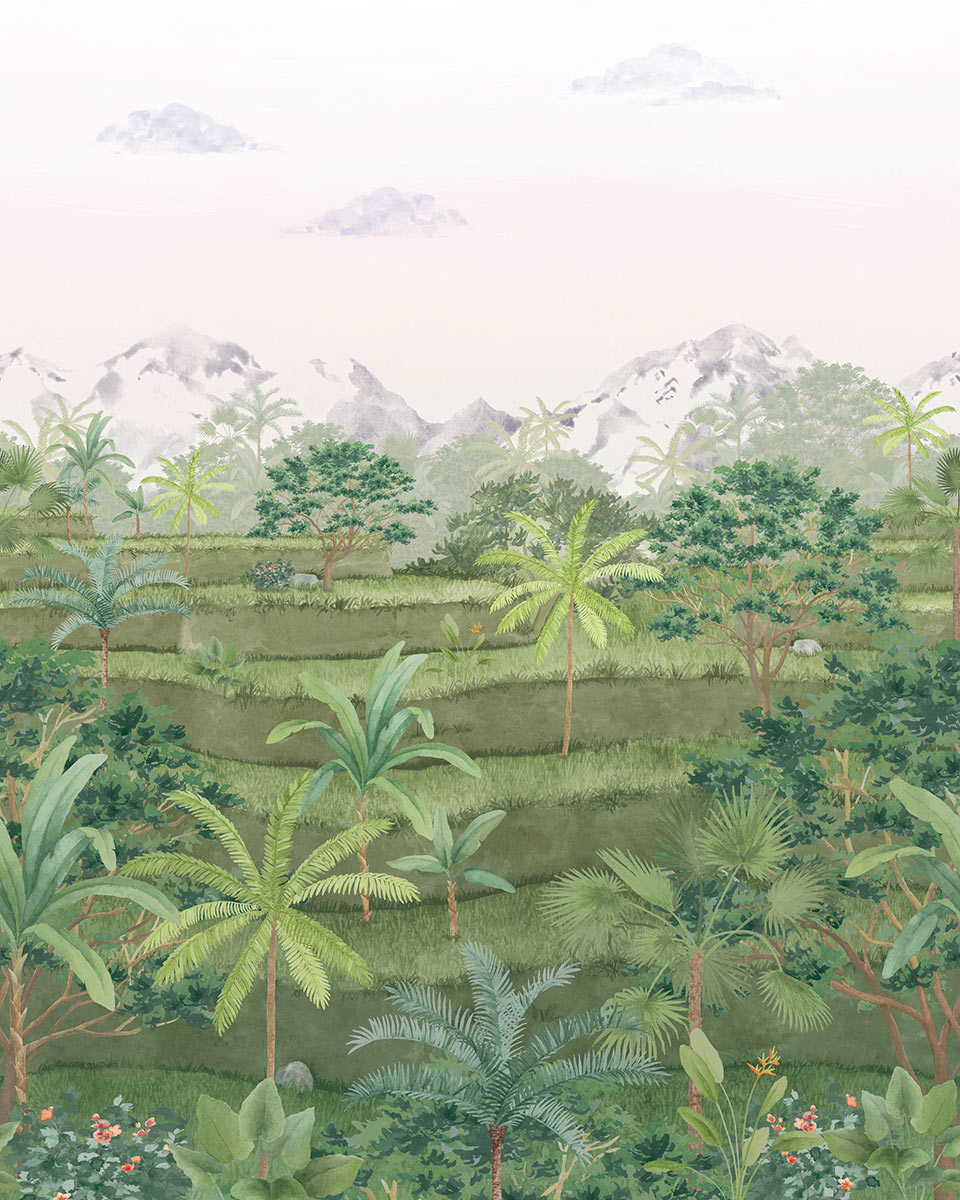 Le papier peint panoramique Rizière de Casadeco immortalise la vue pittoresque de Jatiluwih, dans l’île indonésienne de Bali. Il présente des cocotiers, bananiers et autres arbres tropicaux près des champs de rizières en terrasse, avec des collines brumeuses en arrière-plan. Les figures, imprimées, gardent l’aspect d’aquarelle du modèle originel peint à la main.