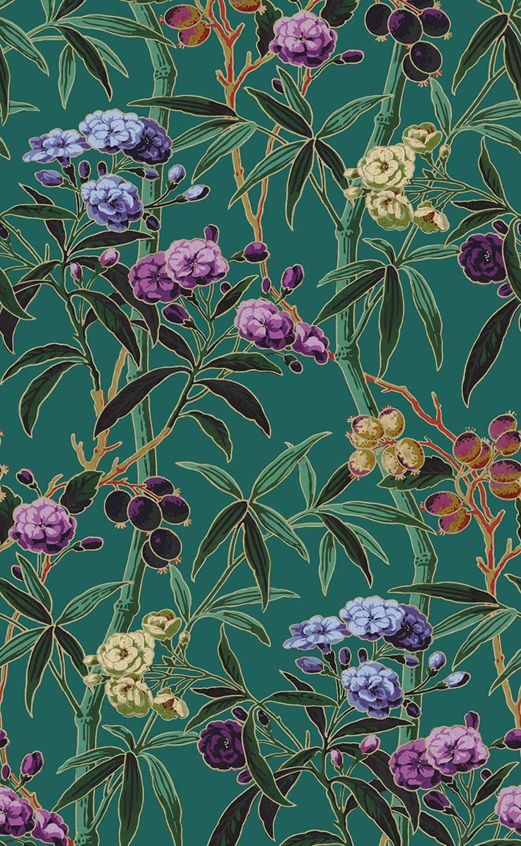 Camelia, un papier peint panoramique de Casadeco, montre les différents stades de floraison de l’arbuste dont il tient le nom. Les figures séduisent par l’intensité de leurs teintes estivales, affichées à grande échelle sur un fond coloré. Celui-ci, en contraste avec la bordure lumineuse des figures, accentue les formes et les couleurs.