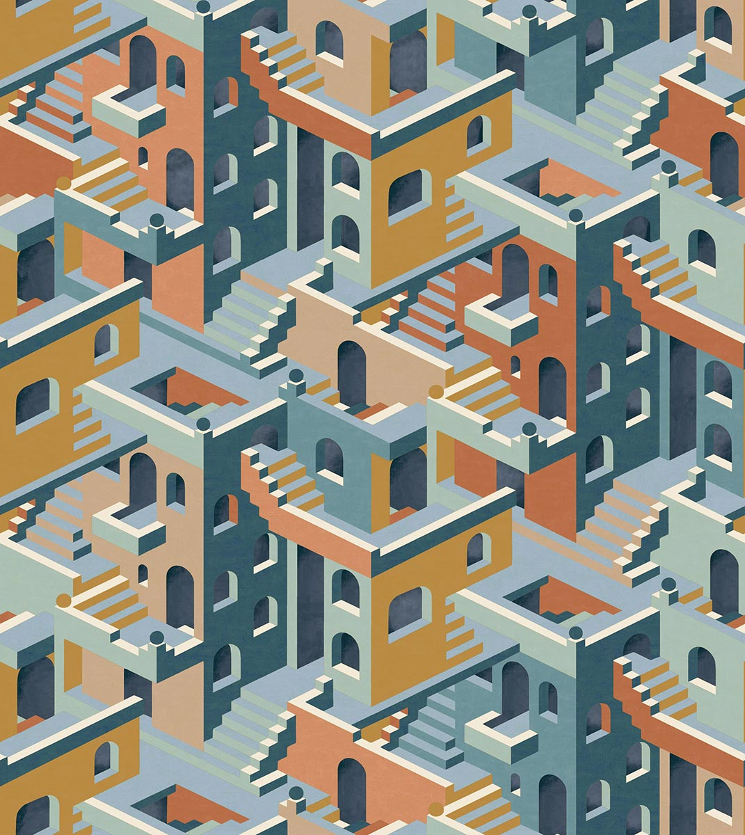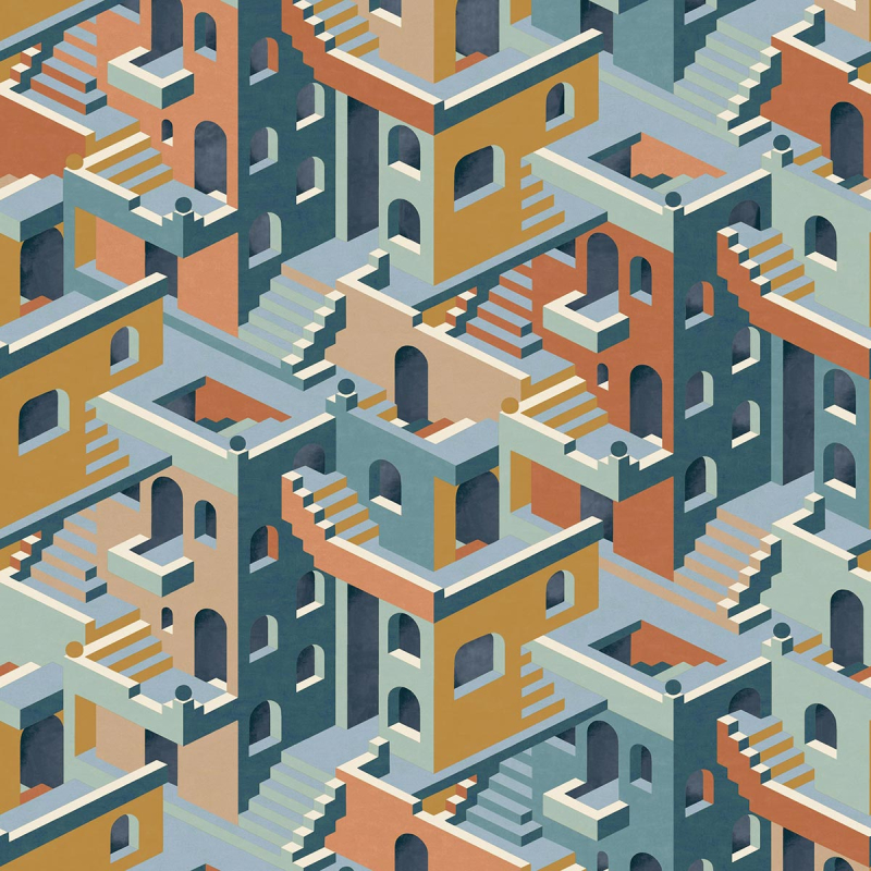 Offrant un terrain de jeu infini au regard, le papier peint panoramique City plonge les intérieurs au cœur d’une ville abstraite. Les maisons s’enchaînent à l’infini, avec des portes et des fenêtres qui se répondent. Les escaliers accentuent l’aspect tridimensionnel, et invitent à une longue promenade. Ce tableau vivant mêle nuances vives et profondes, créant un jeu de contraste captivant.