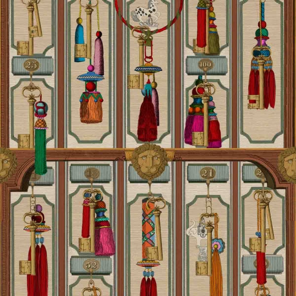 Grand Suite Keys présente un papier peint orné de pompons colorés et de détails brodés exquis. Cet objet qui avait auparavant une utilité purement fonctionnelle a été élevé au rang d'une déclaration élégante à part entière. Présenté par Mindthegap, pour la collection Orient Express, L'attention minutieuse portée aux détails met en évidence une fois de plus la splendeur luxueuse du train.