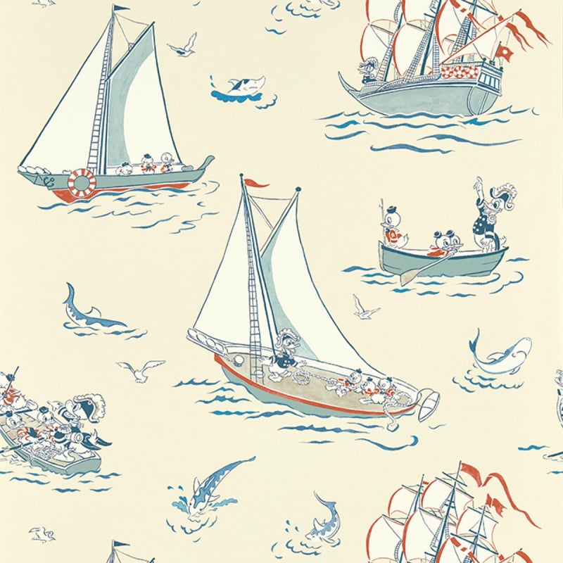 Donald Duck est accompagné de ses neveux, alors qu'ils entreprennent un voyage à travers les sept mers. Présenté par Anderson, en collaboration avec Disney Home, le papier peint a été créé à partir des photos d'animation originales de Disney. Ce tissu nautique présente des embarcations à rames, des yachts et des galions, tous magnifiquement peints à la main et accompagnés de requins et de mouettes.