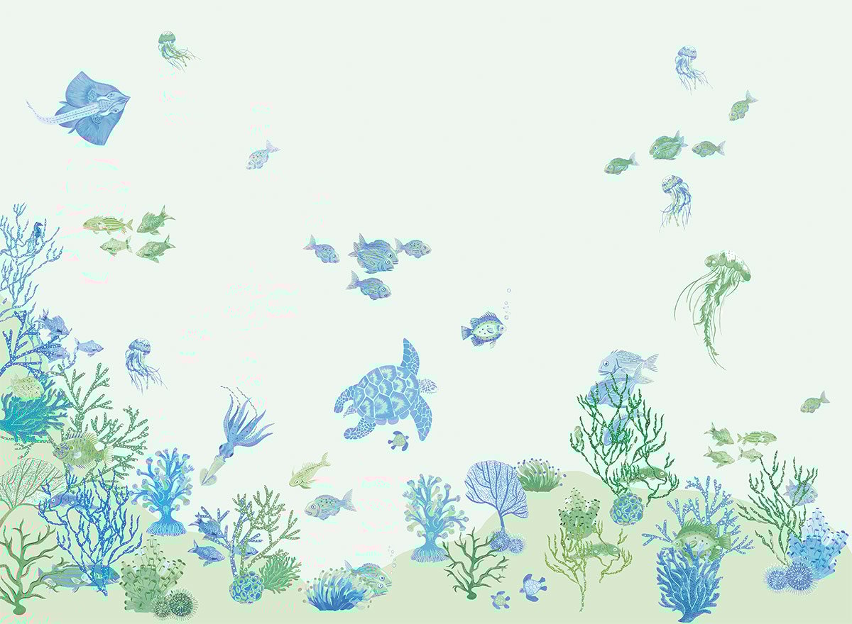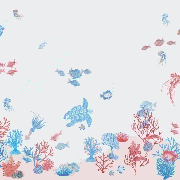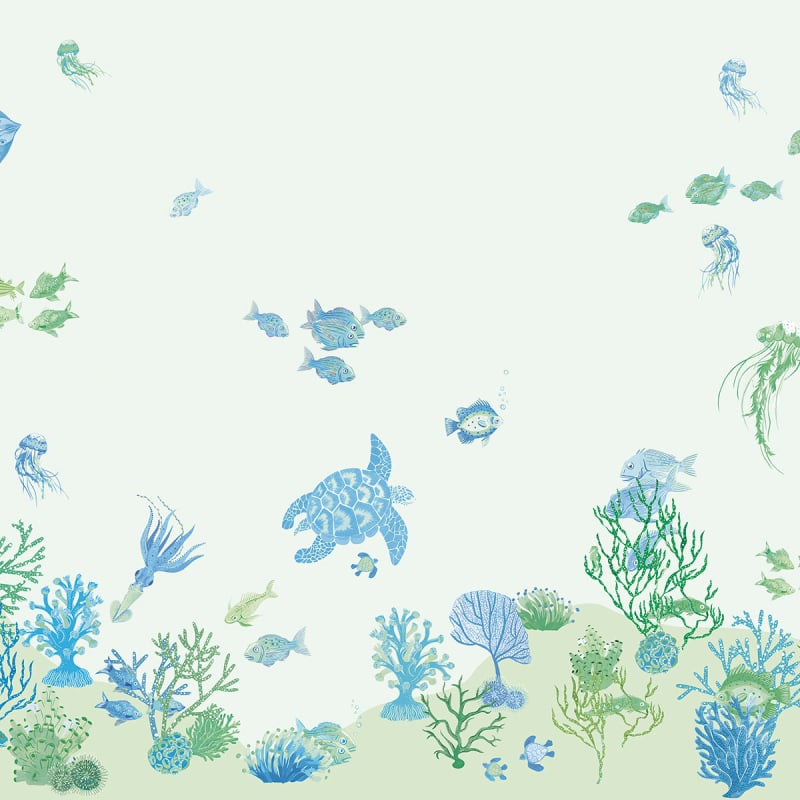 Le papier peint Sous l’Océan ouvre une fenêtre immersive du monde sous-marin avec son design. Peint à la main, il dévoile une scène épanouissante où poissons et tortues marines évoluent gracieusement au fond de l’océan. Les coraux enrichissent ce tableau avec leurs polypes vivement colorés. Cette création de Little Cabari emprunte une palette de nuances aquatiques, apportant une note de douceur aux espaces.
