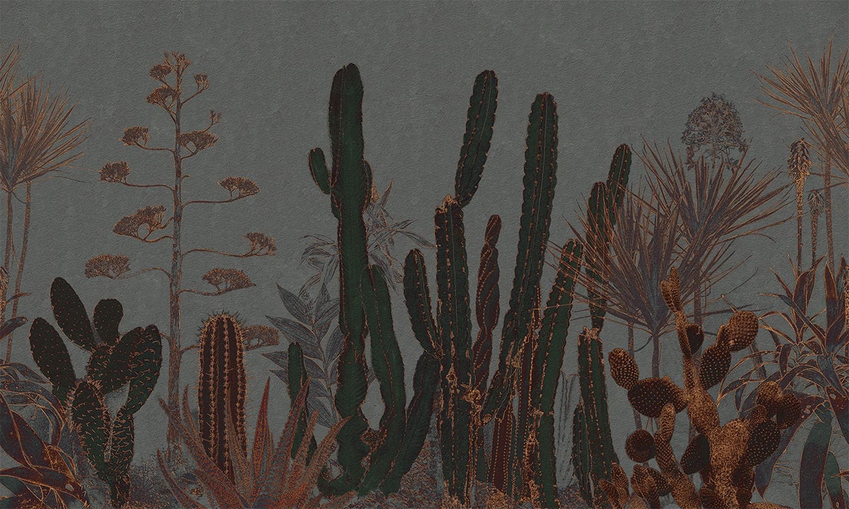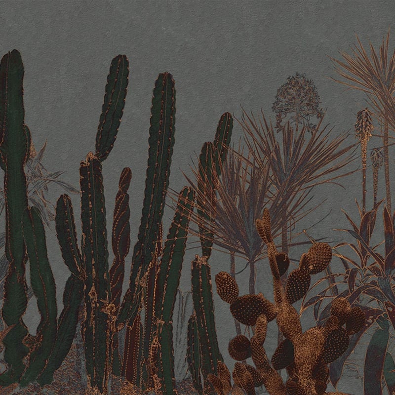 Le papier peint Lanzarote, un modèle panoramique de Inkiostro Bianco, dépeint le paysage d’une île espagnole dont il porte le nom. La créatrice Giorgia Ricci propose ici une végétation de cactus et de palmiers, faisant rêver à la beauté des terres arides. Les couleurs sont légèrement assourdies, afin d’évoquer la fraîcheur du désert en fin de journée.